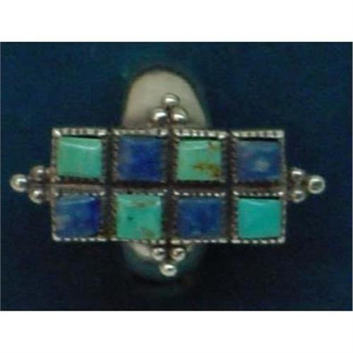 An unusual mixture of maybe Lapis and blue as well as green turquoise mounted in 4 rows of 2 stones in alternating colors, serrated bezel edges with silver beads off the sides of the ends and centers. No makers marking but owned by a lady who worked at the Heard Museum in Arizona. She moved to Tennessee in the 1960s. This ring is unusually heavy and would likely date to the 1950s. 1 1/4" long by just over 1/2" wide. The only marking is 925.