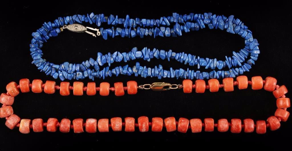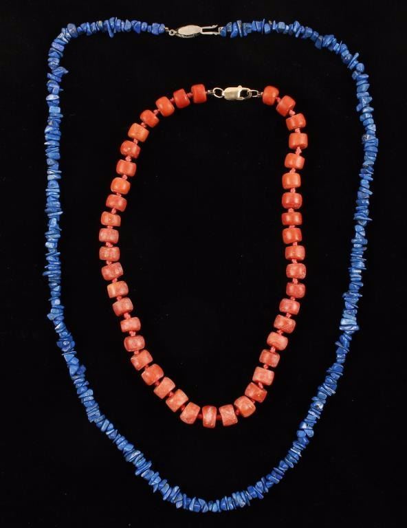 Including: (1) Red Coral large bead necklace with lobster claw style clasp & (1) Lapis chip or baroque bead necklace with fishhook style clasp. Both are in good condition.