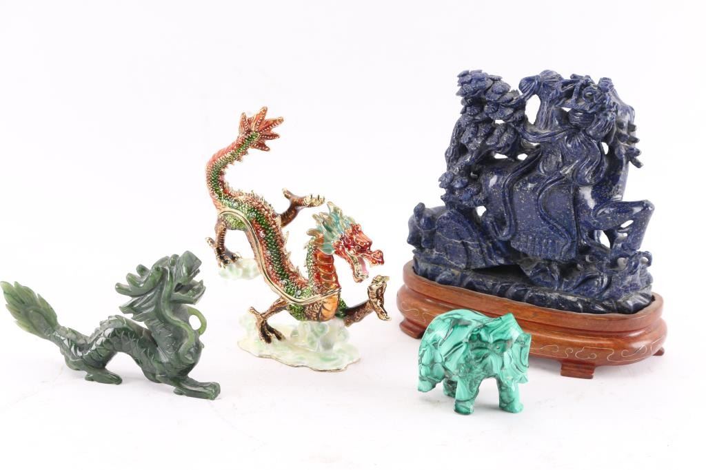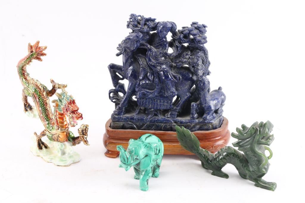 1- Lapis carved sculpture of mystic goddess on horseback in Chinese traditional style. 4-1/2"H x 5"W. Not including base. Retail value $1000+.