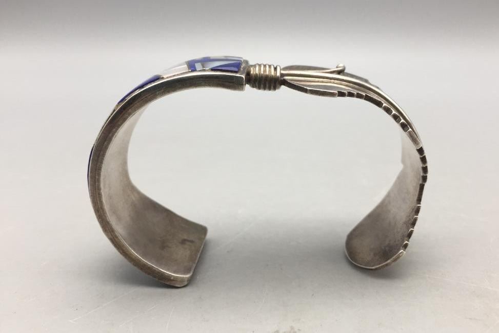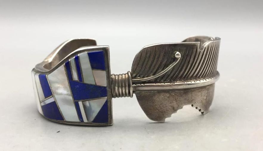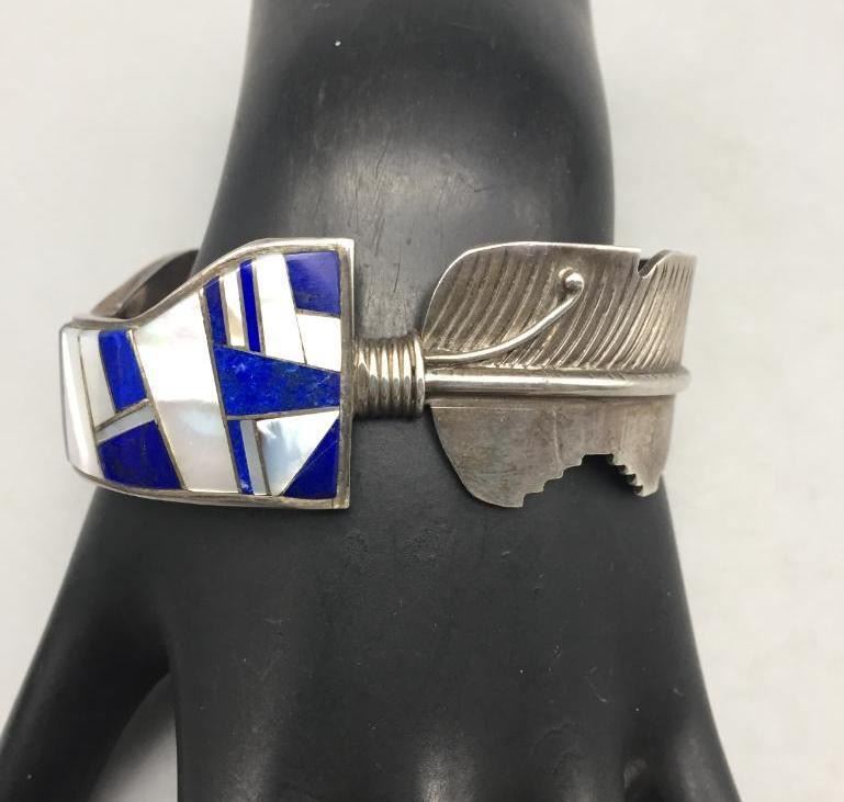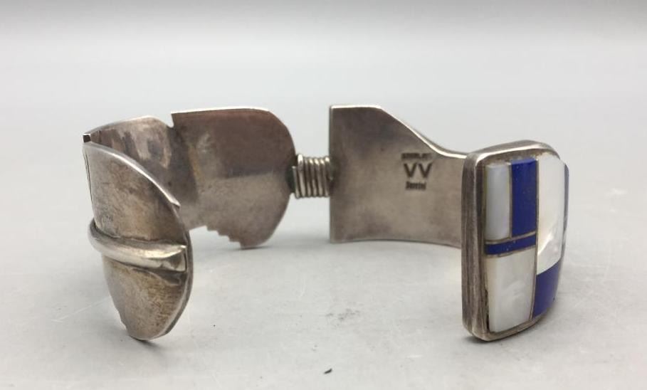 For sale in this lot is a beautiful mother of pearl and lapis bracelet. It has a feather design on one side of the shank. The other side has the lapis and mother of pearl inlay. Marked as sterling. Maker: Hallmarked VV. Approx. Age: Modern. Size: Inside circumference measures 5-1/2". Opening is additional 1-3/8", fitting a 6-7/8" wrist. Width is 1". Weighs 54.3 grams. Condition: Good for its age, normal wear expected. Please look closely at the pictures - they are an important part of our description. Shipping: There will be a $5 handling, packaging fee for shipping this lot. The actual cost of postage will be added on top of that.