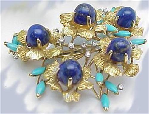 Lapis diamond and turquoise pin in 14kt gold 21.0gr