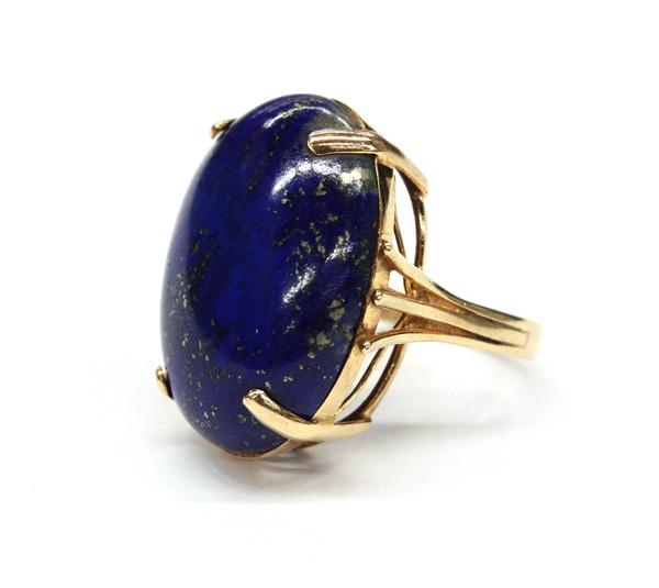 Lapis ring; of 14k yellow gold, set with (1) large oval lapis measuring 26.15 x 19.51 mm. Total ring weight 10.2 grams. Ring size 6