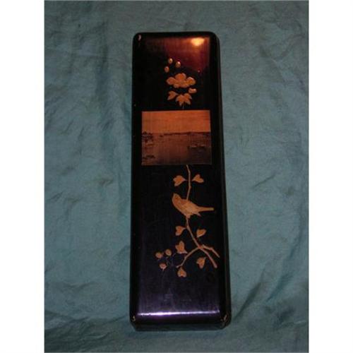 Japanese laquer ware box with photographic image of boats and the see, in the laquer ware.