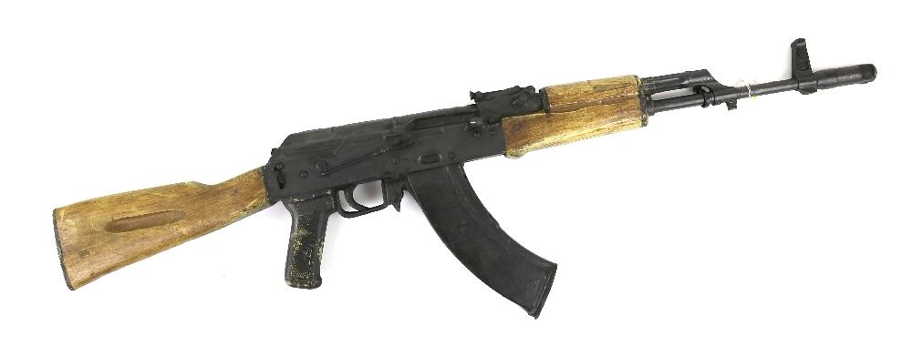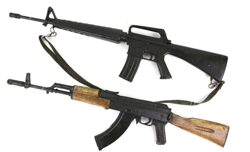 Lara Croft: Tomb Raider (2001) - Screen used AK47 and M16 rubber machine gun props, from the film starring Angelina Jolie. Both made from rubber, length 93cm and 97cm respectively (2).Information - Please satisfy yourself to Firearms laws in your country and shipping restrictions before purchasing this lot.