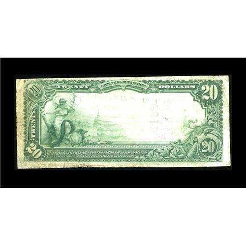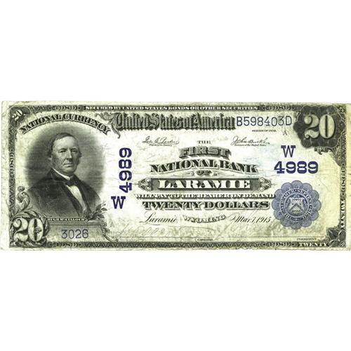 <B>Laramie, WY</B></I> - $20 1902 Plain Back Fr. 657 <B>The First NB</B></I> Ch. # (W)4989<BR>An amply margined <B>Fine</B></I> we'd have been tempted to classify as Very Fine but for some roughness evident at the bottom and right margins. While somewhat faint, the stamped signatures are still there and the overall degree of crispness and paper body is superior to that typically encountered for the assigned grade. A scarce and desirable note from the Equality State.