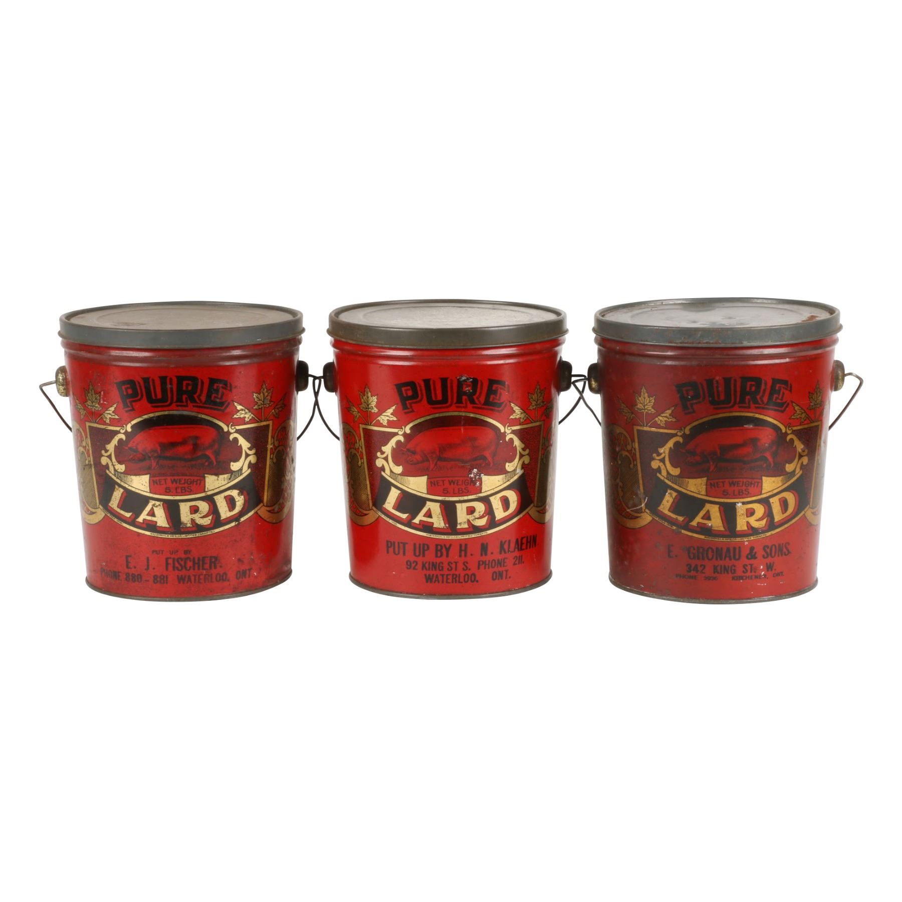 Three (3). Canadian. Circa 1940. Tin litho. Kitchener and Waterloo merchants. 5lb size each. Minor oxidation to one lid. $100-150.