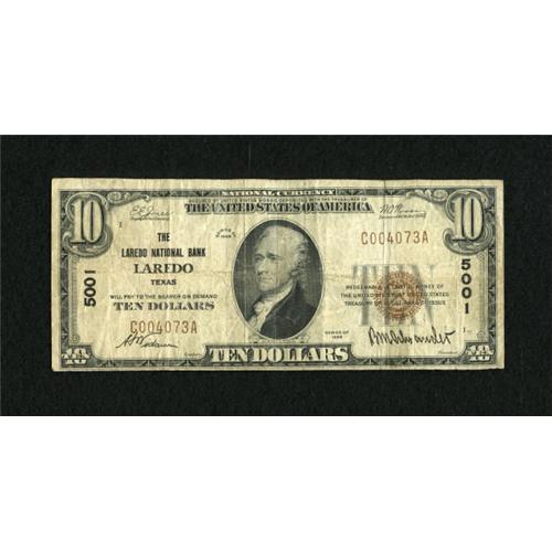 <B>Laredo, TX</B></I> - $10 1929 Ty. 1 <B>The Laredo NB</B></I> Ch. # 5001<BR> Even circulation is noticed on this example with signatures of A.L. Vifraurr and B.M. Alexander. <B>Very Good-Fine</B></I>.<BR><BR><b>Shipping:</b> Coins & Currency (<a target="_blank" href="http://www.heritageauctions.com/common/shipping.php">view shipping information</a>)