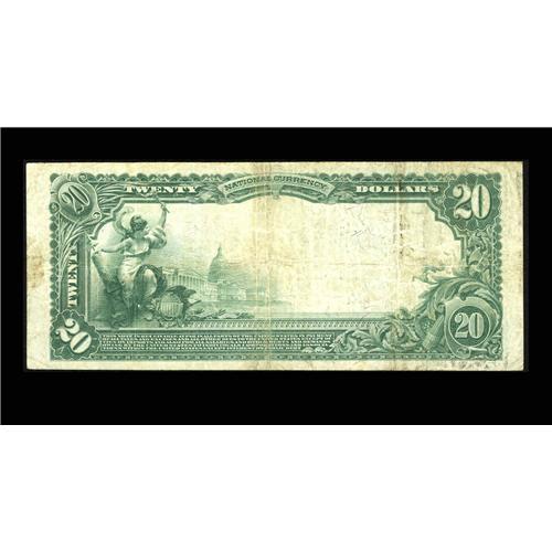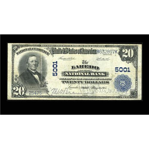 <B>Laredo, TX</B></I> - $20 1902 Plain Back Fr. 658 <B>The Laredo NB</B></I> Ch. # 5001<BR>Just one quarter of the 32 large notes listed in the census from here are of the $20 Plain Back variety. This <B>Fine</B></I> example has especially generous margins and still displays the officers' stamped signatures. This always popular South Texas border town is seldom available in large size. We expect tonight's offering will sell for about...