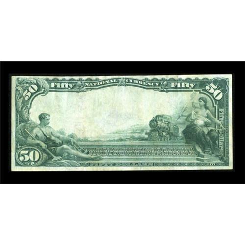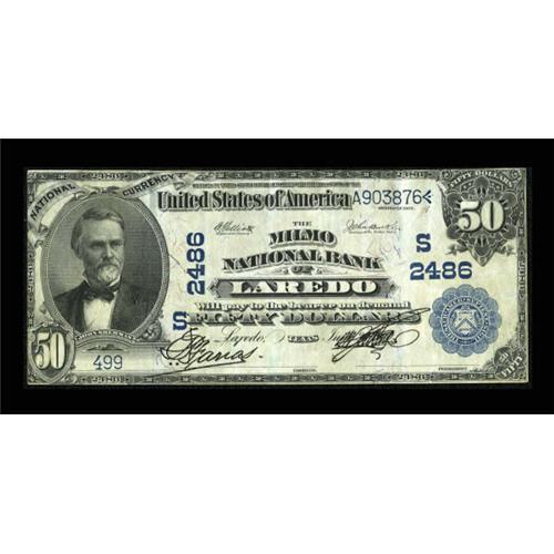 <B>Laredo, TX</B></I> - $50 1902 Plain Back Fr. 683 <B>The Milmo NB</B></I> Ch. # (S)2486<BR> This note comes from a rather odd south Texas bank with an interesting history. It was chartered in 1880 and took its title from its principal owner, a Mexican citizen of English extraction named Patricio Milmo O'Dowd. He and his son, Patricio Milmo Vidaurri, owned and operated the bank through the turmoil of the Mexican Revolution, changing its name to the First National Bank in 1924. All of the known large examples bearing this title are high denomination specimens, and all we can recall handling, whether Second or Third Charters, are closely trimmed on all four sides, lending a New England appearance to notes which come from a community as far socially and culturally removed from New England as it is possible to be and still remain in the same country. <B>Very Fine-Extremely Fine,</B></I> with the President's printed signature somewhat off register and covering the plate date. <BR><BR><b>Shipping:</b> Coins & Currency (<a target="_blank" href="http://www.heritageauctions.com/common/shipping.php">view shipping information</a>)