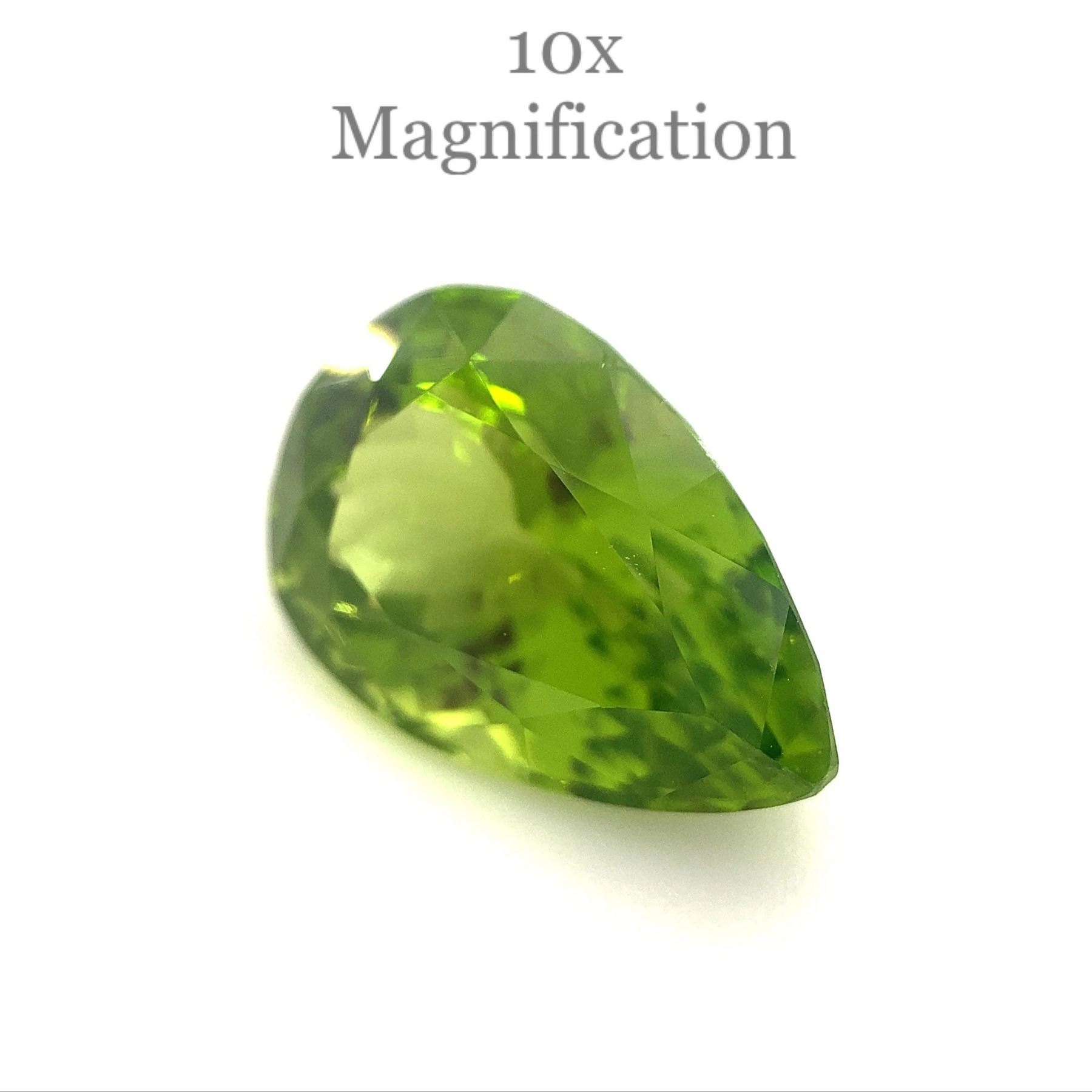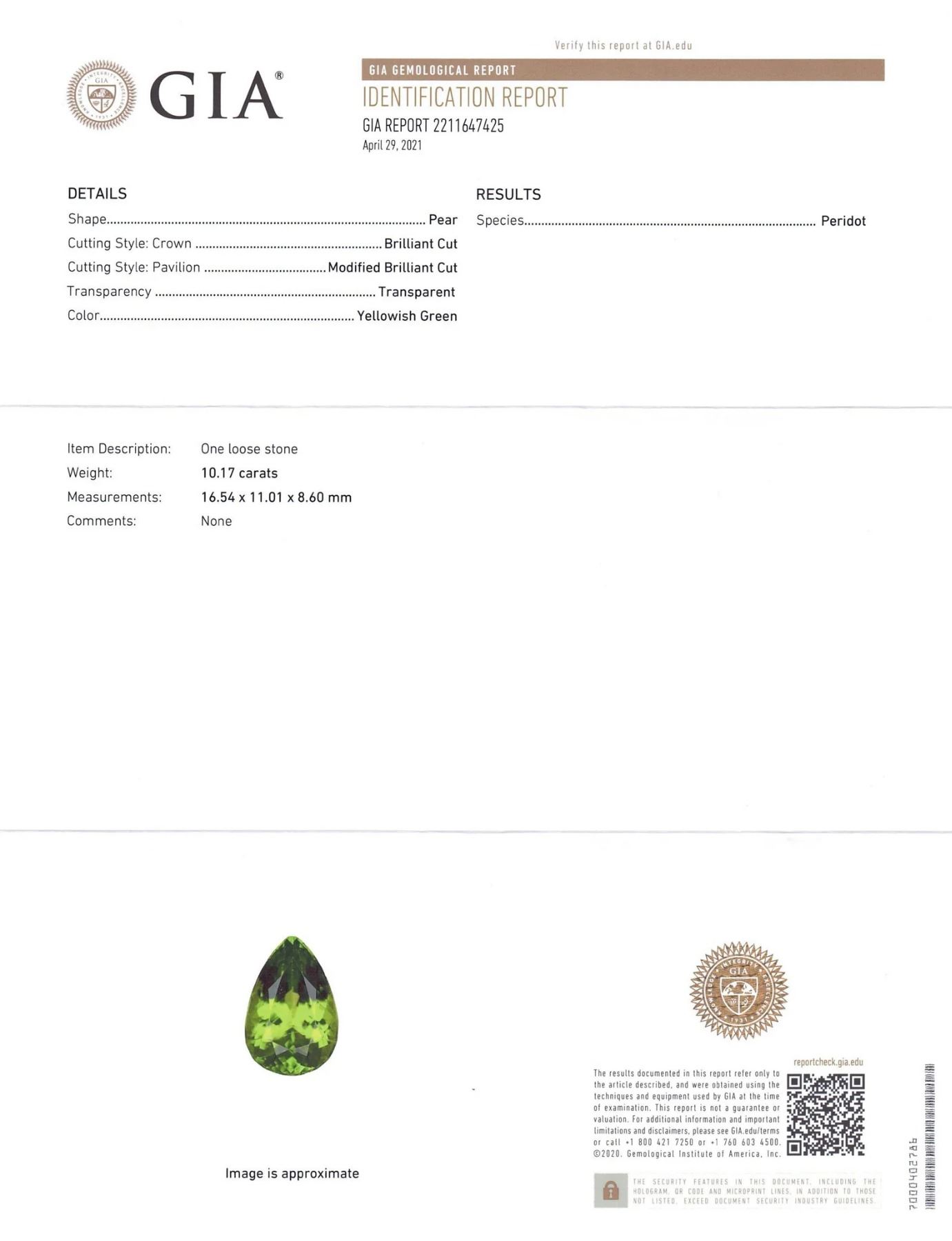 This VVS1 10.17 Ct Yellowish Green Peridot measures 16.54 x 11.01 x 8.60 mm with a brilliant pear cut. The hue and dark tone on this peridot is absolutely stunning. Origin: Burma/ Myanmar. Treatment: None. Please see the certification for additional information.