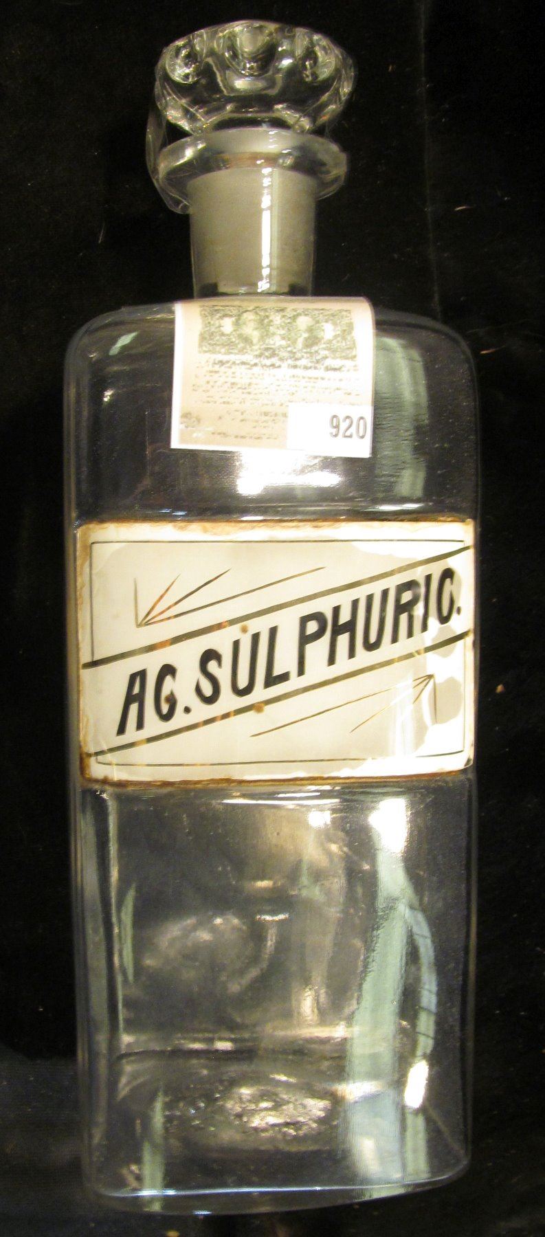 Large 12 1/2" x 4 1/4" Clear Glass Apothecary Jar with label "AG. Sulphuric" and glass stopper. Chip on rim.