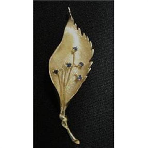 GORGEOUS 14K GOLD LARGE BROOCH,DEPICTING FIGURAL LEAF ADORNED WITH 5 BLUE SAPPHIRES, as per image - EXCELLENT CONDITION,VERY PRECIOUS GOLD BROOCH, Stamped on the of the stem 14k, I AM SORRY IN SPITE OF THE LATEST MODEL, DIGITAL CAMERA, I AM NOT STILL SATISFIED WITH THE QUALITY OF THE PICTURE, THE BROOCH IS STUNNING, WITH THE SUBTLE GENTLE "BRUSHED" SHINE OF THE GOLD SHOWING OFF DELICATE STEMS OF THE BLUE SAPPHIRE "FLOWERS", THE BACK OF THE BROOCH IS SMOOTH AND SHINING,MEASURING 3" LONG X 3/4" WIDE,US Buyer to pay 7.00 for shipping plus insurance.THANKS.