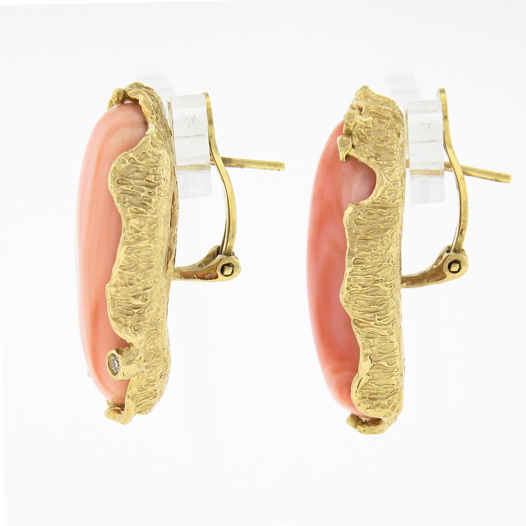A solid 14k yellow gold earrings, with 2 oval cabochon cut natural corals (27x16.8mm & 27.3x16.1mm), and 6 round brilliant cut natural diamonds (G/H - VS2/SI1 ; 0.12ctw). The earrings measure approximately 30.2x20.5mm and weigh a total of 23.43 grams.