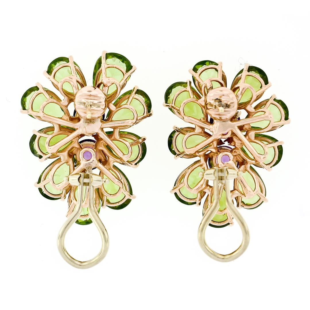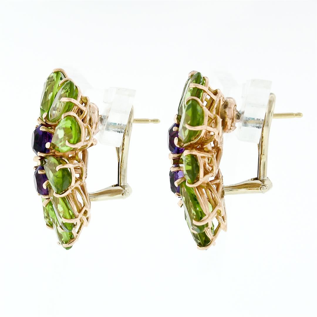 A pair of solid 14k rose gold large cluster earrings, with 4 round cut natural amethysts (5mm - 1.60ctw), surrounded with pear cut natural peridots (5mm - 1.60ctw). The earrings measure approximately 26.6x20.4mm and weigh a total of 12.83 grams.