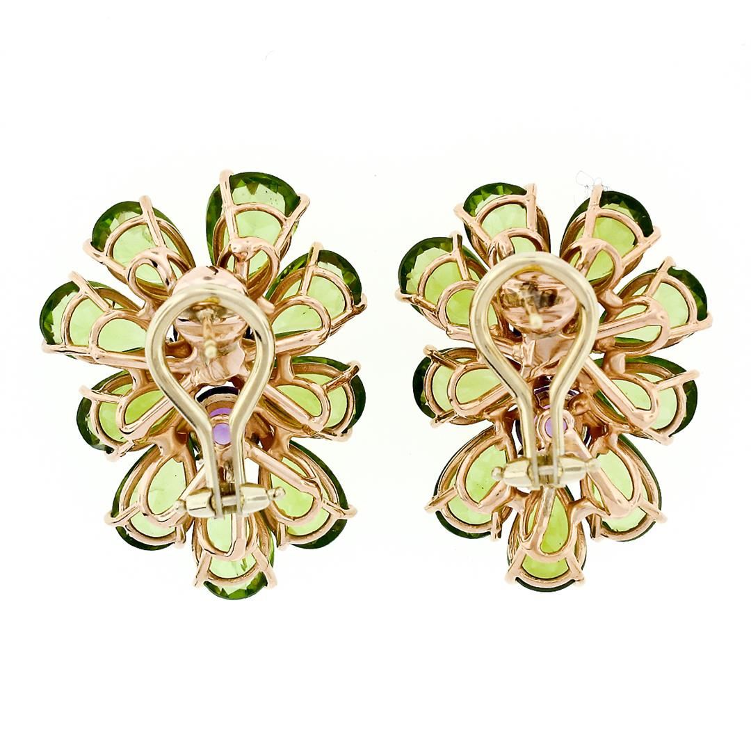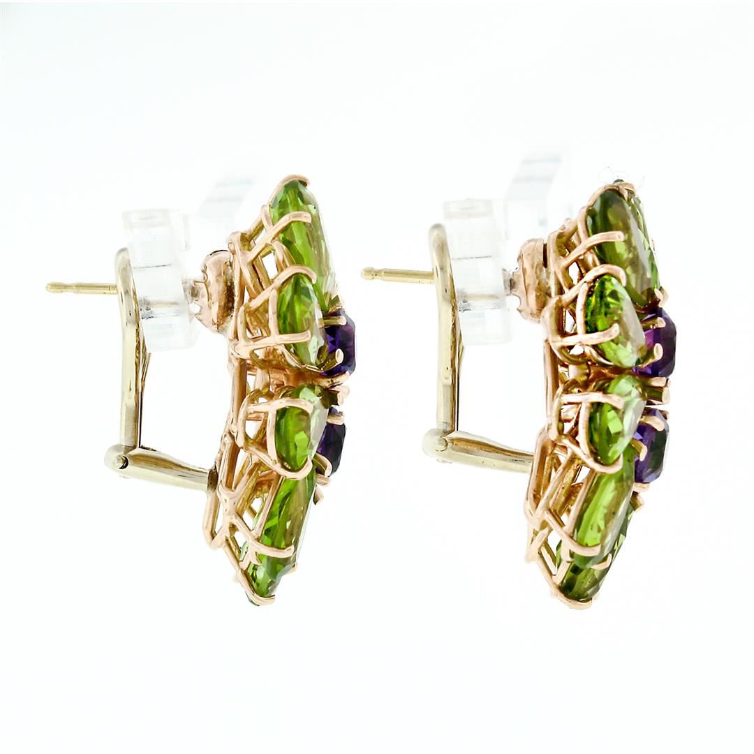 A pair of solid 14k rose gold large cluster earrings, with 4 round cut natural amethysts (5mm - 1.60ctw), surrounded with pear cut natural peridots (5mm - 1.60ctw). The earrings measure approximately 26.6x20.4mm and weigh a total of 12.83 grams.