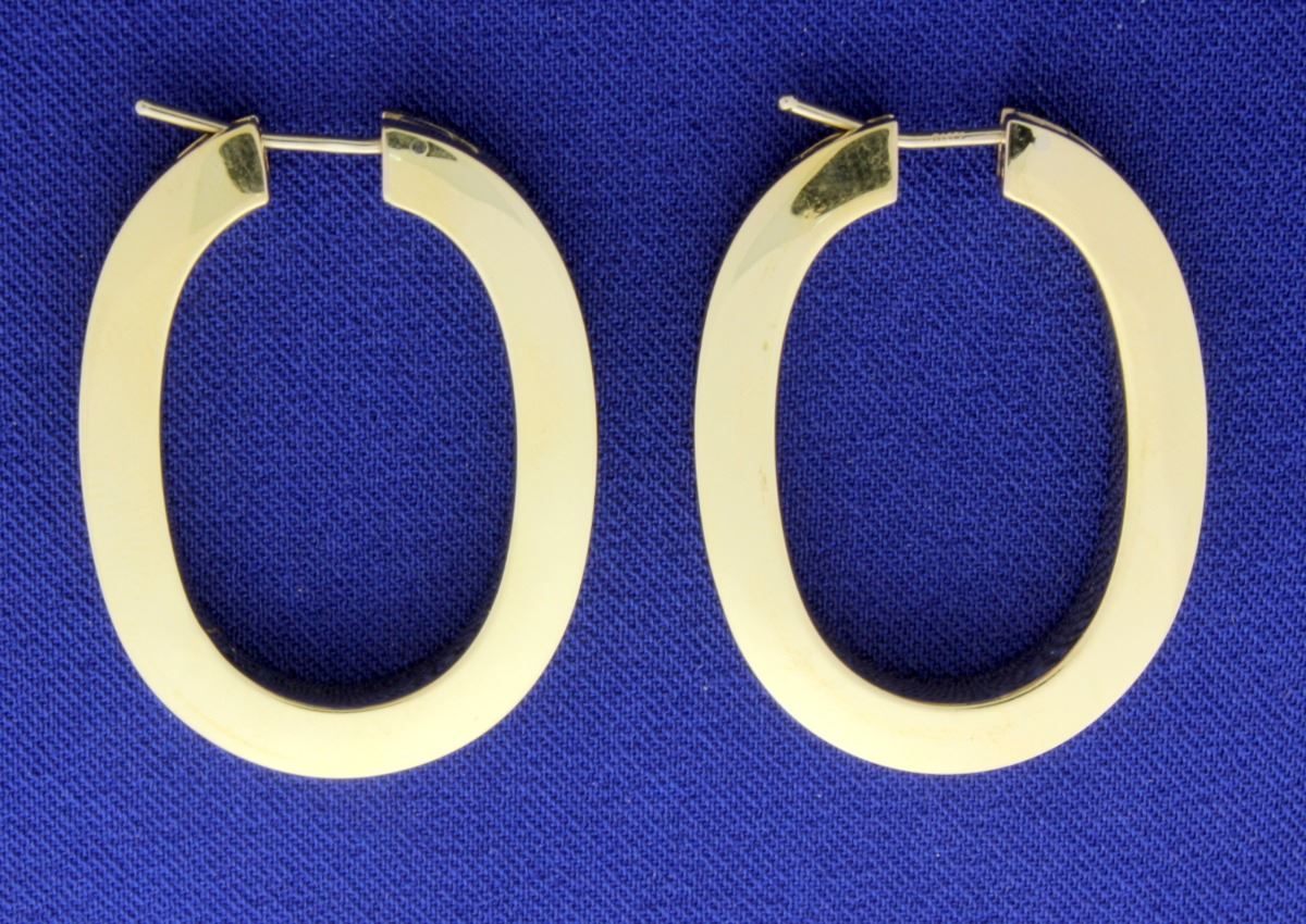 These have a very large look, but are semi-hollow for comfort. 3/16" square in thickness, the ear wires are 14k white gold. 11.2g