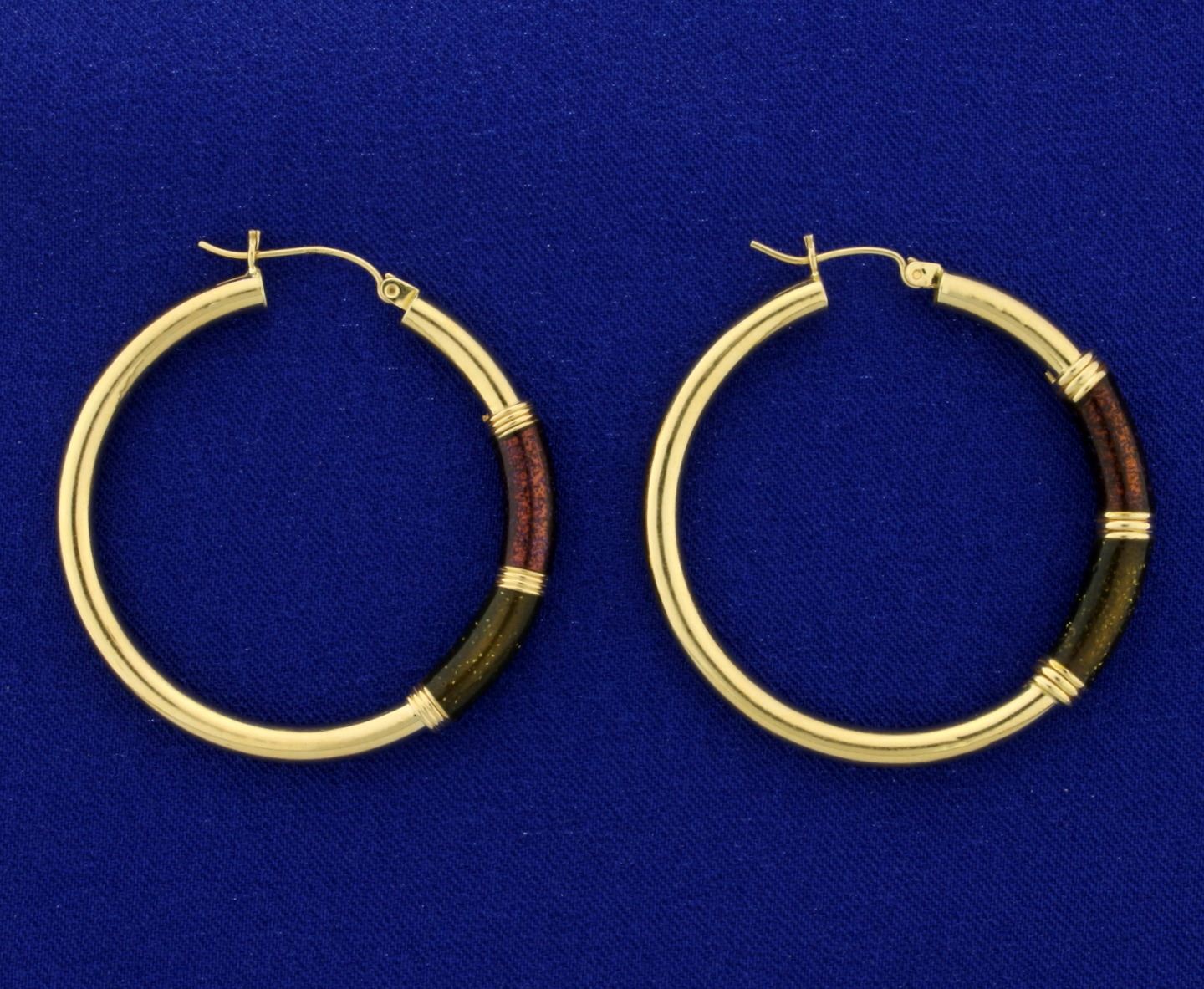 In 14k yellow gold. 1 5/8" in diameter. Some minor scratches/dents which does not take away from beauty of these unique earrings. With unique specially applied colored gold dust detail. 4.8g.