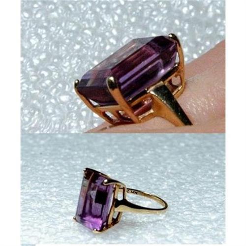 Wow, this is an amazing solid 14K Gold Amethyst ring. The ring shank is a size 6. The approximate carat wt is of the gemstone 6.1. The top of the ring is 17mm x 10mm and a depth of 5mm. It has stepped faceted sides. The color is rich purple.<p> The inside of the ring shank is marked by the maker "UTC" then it is marked 14K. <p> The stone is in very very good condition. There are a few microscopic scratches that only are detectable under high magnification of a jewelers loop. The stone needs some cleaning. <p>