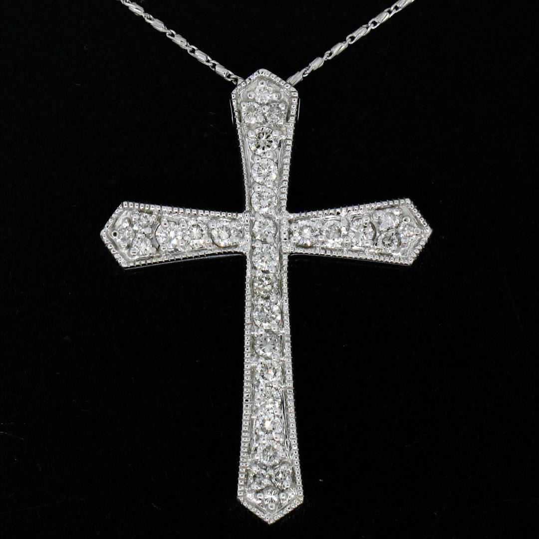 A new solid 14k white gold large cross pendant, featuring 30 round brilliant cut natural diamonds (G/H - VS2/SI1; 1.18ctw). The pendant weighs a total of 9.64 grams, measures 38.32x28.10mm including the bail, with 18 inch Fancy Textured link chain.