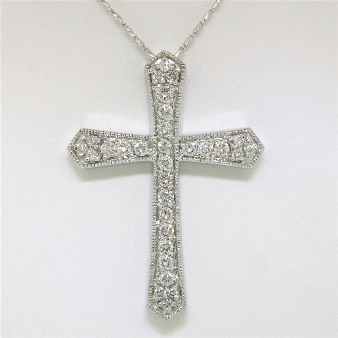 Large 14k White Gold 1.18 ctw Round Diamond Cross Pendant w/ 18" Fancy Link Chai