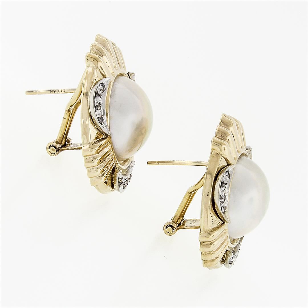 An estate solid 14k yellow & white gold button earrings, with 2 round shape mabe pearls (13.9mm), and 24 round brilliant cut natural diamonds (H/I - SI1/SI2 ; 0.12ctw). The earrings measure approximately 25.48mm in diameter and weigh a total of 9.70 grams.