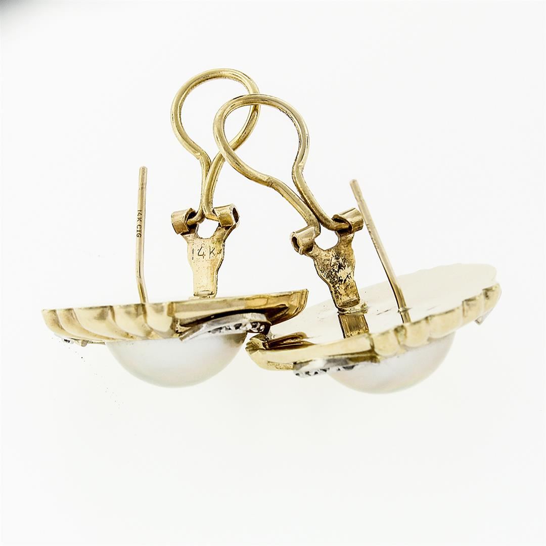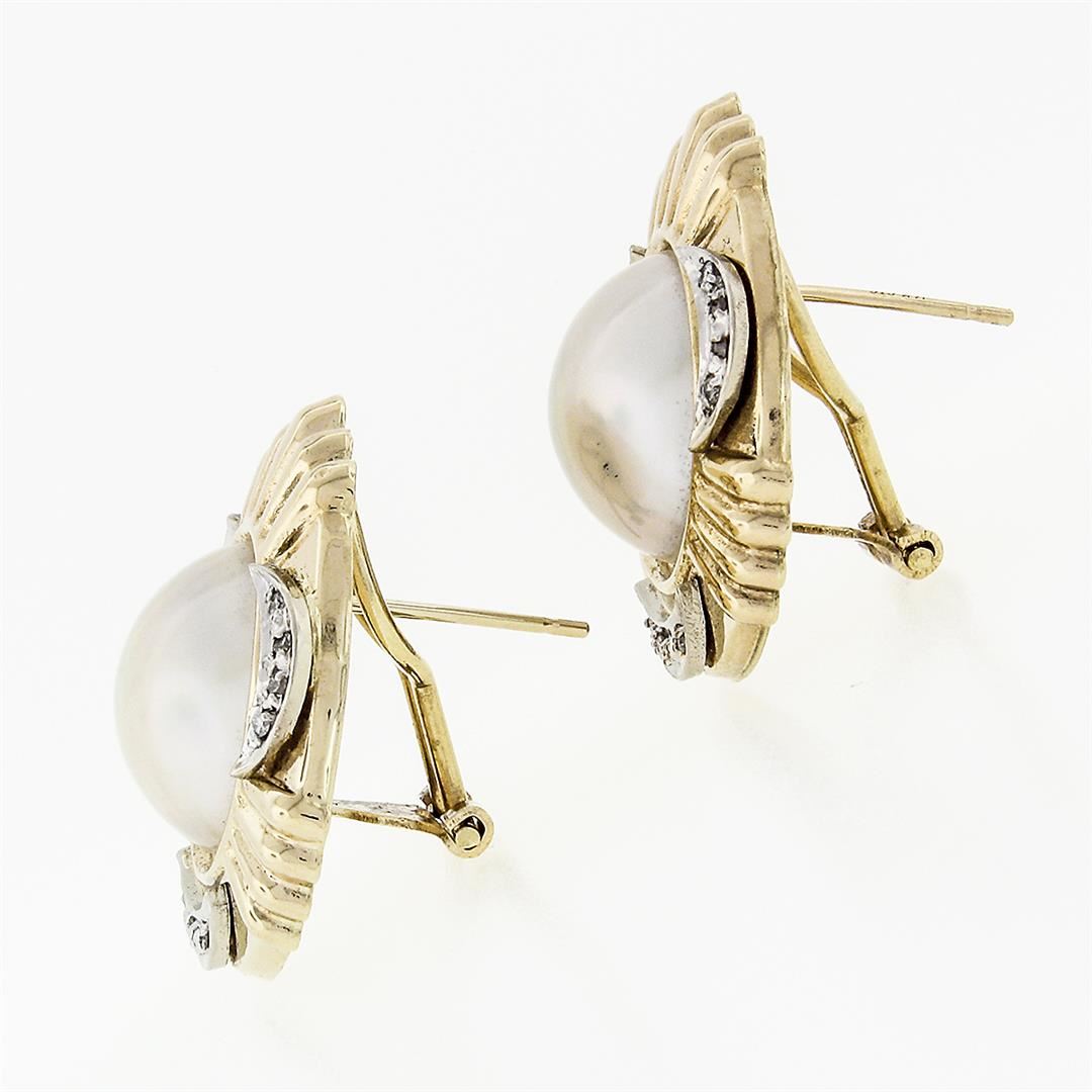 An estate solid 14k yellow & white gold button earrings, with 2 round shape mabe pearls (13.9mm), and 24 round brilliant cut natural diamonds (H/I - SI1/SI2 ; 0.12ctw). The earrings measure approximately 25.48mm in diameter and weigh a total of 9.70 grams.