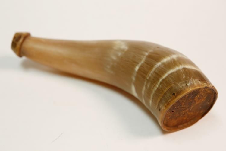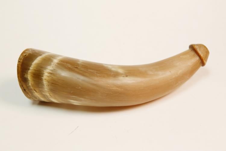 Very large sized powder horn that measures 12" in length with a 3" diameter base that has been carved with initials. The horn has been so well scrapped that it allows light to penetrate and shows as a translucent honey color. The spout end is also very large with almost a 3/4" charging hole and a very wide flared spout edge. Would have to be for a fowling piece or cannon.