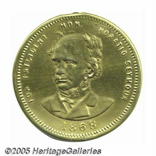 <B>Large 1868 Horatio Seymour Campaign Brass Shell</B></I> Listed in Sullivan as HS 1868-13, this item is actually half of the casing for a "porthole" Seymour - Blair ferro jugate. But it displays very nicely as a uniside Seymour shell item. Beautiful condition. 35 mm. Lot:258