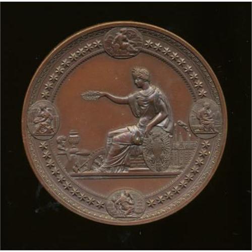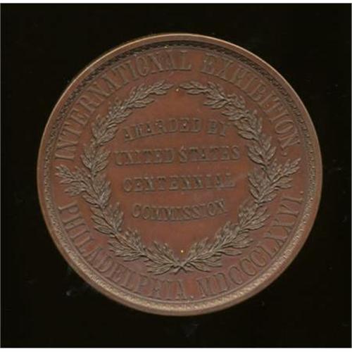 <B>Large 1876 U.S. International Centennial Exhibition Award Medal, AU58 Uncertified.</B></I> Copper, 76 mm, 285.0 gm, rim 9.9 mm thick. Obverse seated female figure holding a wreath, bust and urn, implements of industry, four small equidistant peripheral cartouches. Reverse AWARDED BY THE UNITED STATES CENTENNIAL COMMISSION in center, foliar wreath, INTERNATIONAL EXHIBITION PHILADELPHIA MDCCCLXXVI. Lustrous medium-brown, problem-free fields with just a touch of rub on the highpoints, an extremely appealing piece!<BR><BR><b>Shipping:</b> Coins & Currency (<a target="_blank" href="http://www.heritageauctions.com/common/shipping.php">view shipping information</a>)