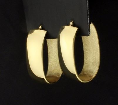 In 18K yellow gold there is a brushed finish on inside and shiny finish on the outside of hoops. They are 1 1/4 inch long. 5.6g