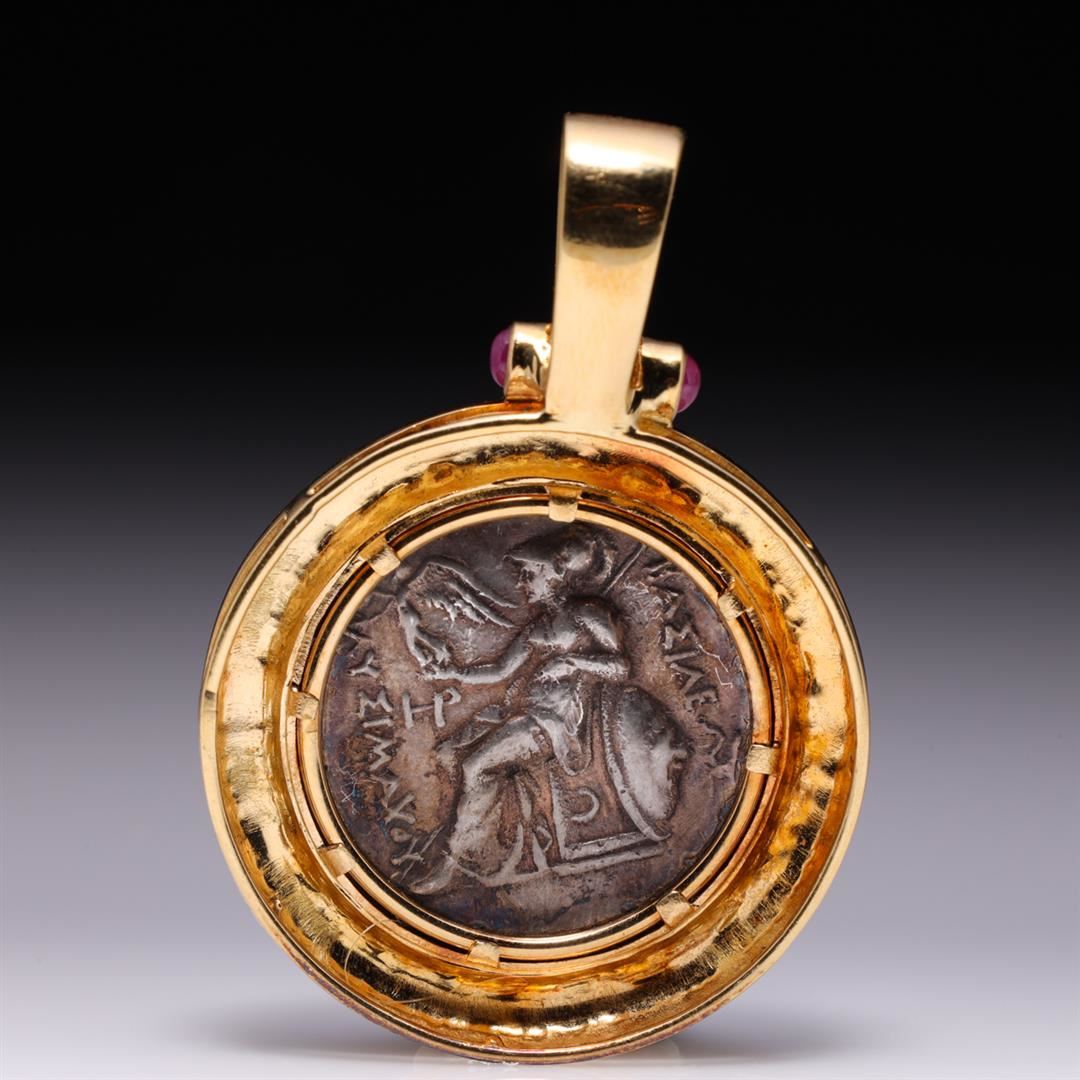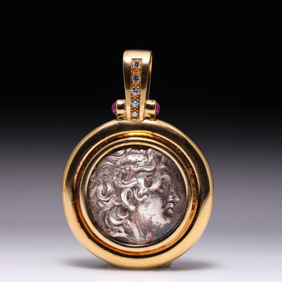 Large 18K Yellow Gold Pendant With Rubies, Diamonds & Ancient Silver Alexander The Great Coin containing two cabochon rubies weighing approximately 0.20 cts. Five round cut brilliant diamonds weighing approximately 0.10 cts. Total weight is 36.7 gm. Estim