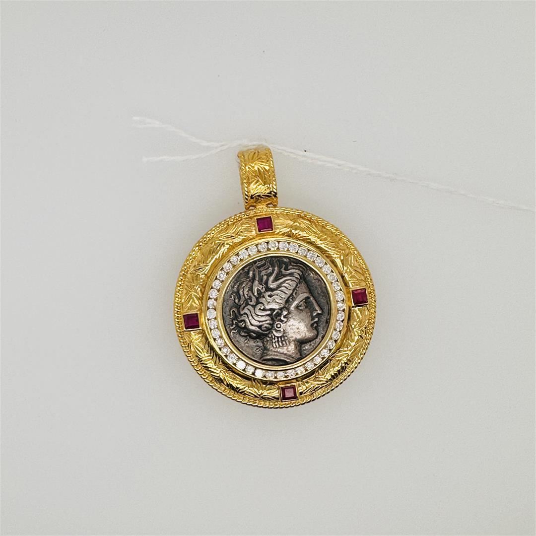 Large and elaborate 18k yellow gold pendant designed by R. L. Kay; a finely chased bale and border set with four rubies with interior border of white diamonds surround an ancient silver Greek, marked 750 with hallmark; gross weight 28.9g, 2" x 1 1/2" (app