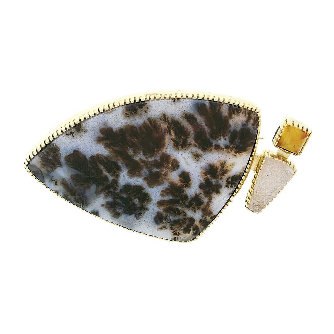 A solid 18k yellow gold pin brooch, with 1 flat freeform cut natural jade (52.82x35.53mm), & 1 square sugarloaf cut natural amber (5.78mm), with 1 geode section natural quartz (13.33x7.28mm). Measures 36.83x65.51mm and weighs a total of 24.43 grams.