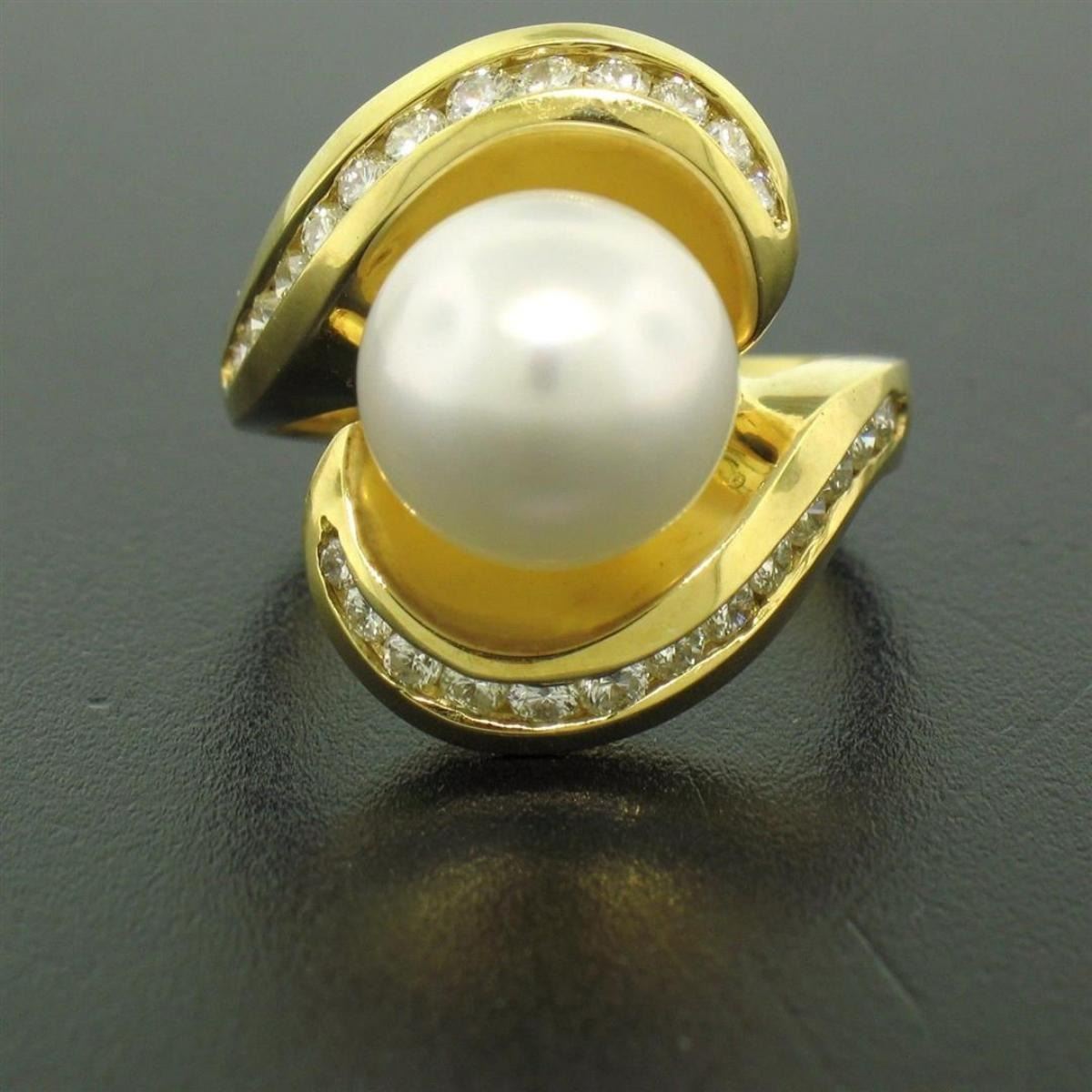 One Large 18k Yellow Gold 10.6mm Round White Pearl Solitaire & Diamond Cocktail Ring. Item Details: Material:  18K Solid Yellow Gold, Weight:  12.2 Grams, Stone(s):  (1) Natural Genuine South Sea Pearl - Pure White Color - 10.60mm, (26) Natural Genuine Diamonds - Round Brilliant Cut - Channel Set - F Color - VS1 Clarity - 1.00ctw (approx.), Total Carat Weight:  1.00 (approx.), Ring Size:  7.0, Ring Width:  20.74mm, Ring Height:  12.25mm rise off the finger Condition:  Estate - Like New Ready to Wear!
