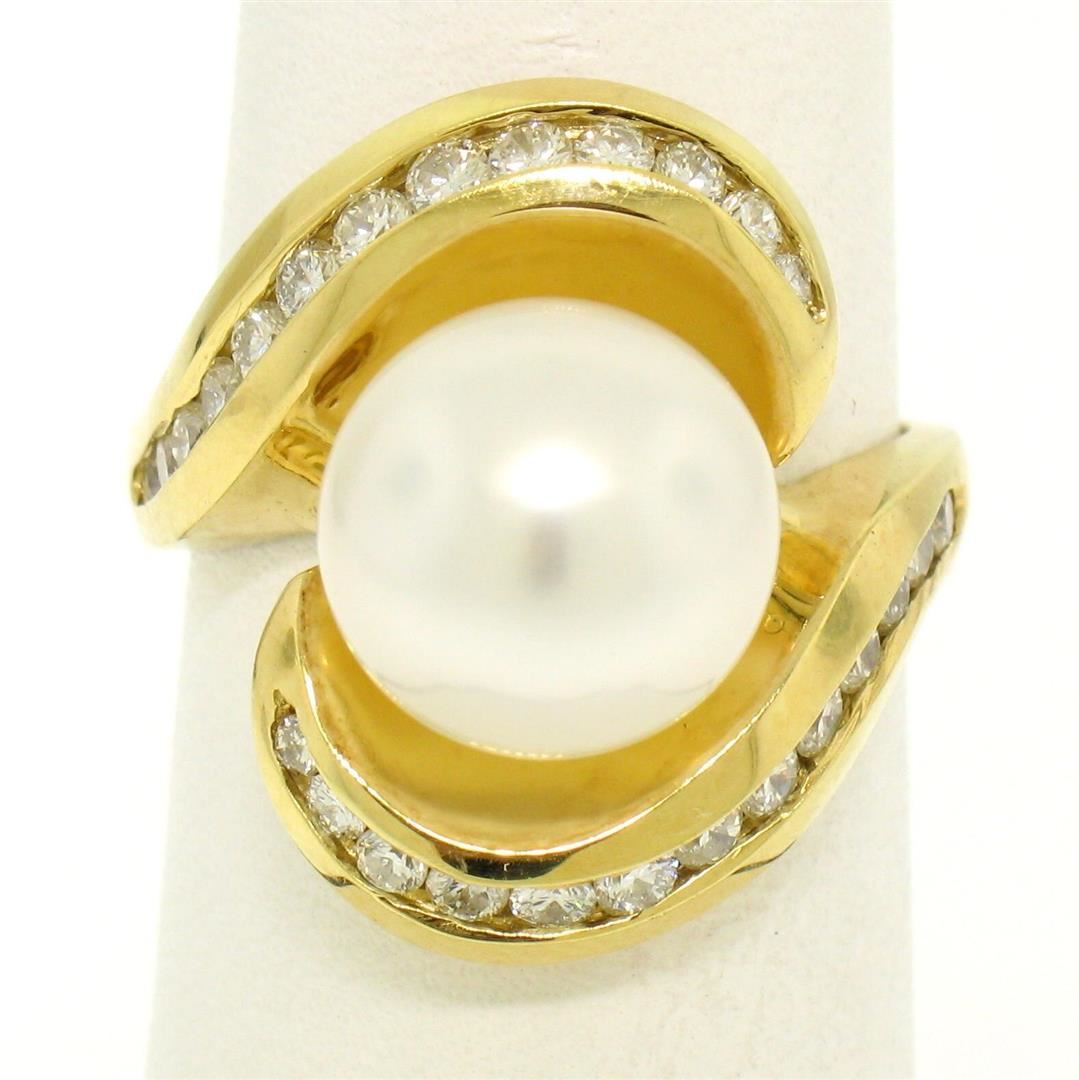 An estate solid 18k yellow gold cocktail ring, featuring 1 natural south sea pearl (10.60mm), with 26 round brilliant cut natural diamonds (F - VS1 ; 1.00ctw). The ring is size 7.0, weighs a total of 12.2 grams, and measures 20.74mm wide.