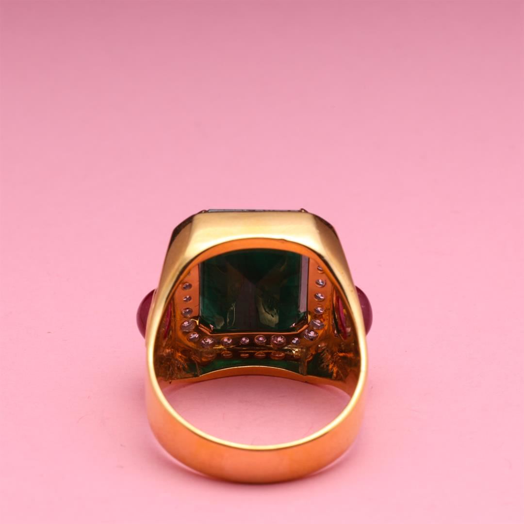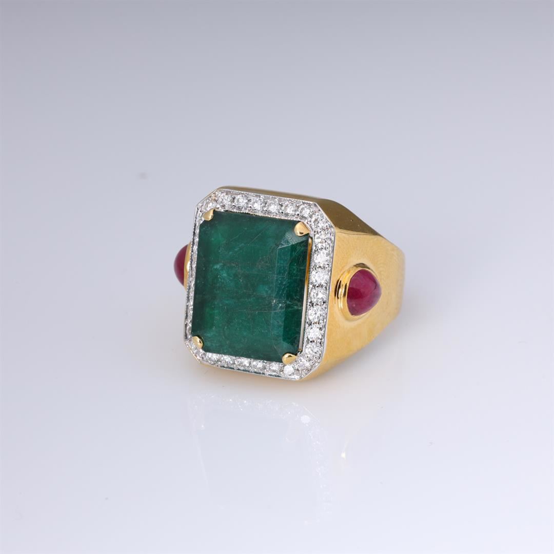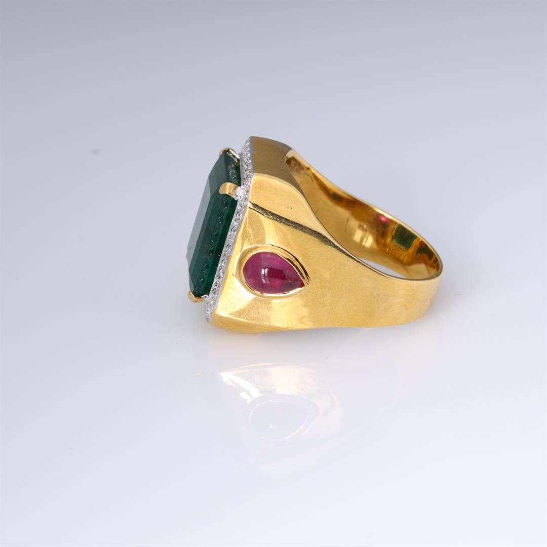Large 18k yellow gold by Victor Loo; the claw set center emerald surrounded by one row of white diamonds, each shoulder with two bezel set teardrop rubies, marked 18k to interior, stone loose in mounting; gross weight 16 g, size 11