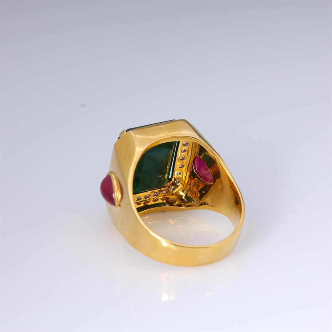 Large 18k yellow gold by Victor Loo; the claw set center emerald surrounded by one row of white diamonds, each shoulder with two bezel set teardrop rubies, marked 18k to interior, stone loose in mounting; gross weight 16 g, size 11