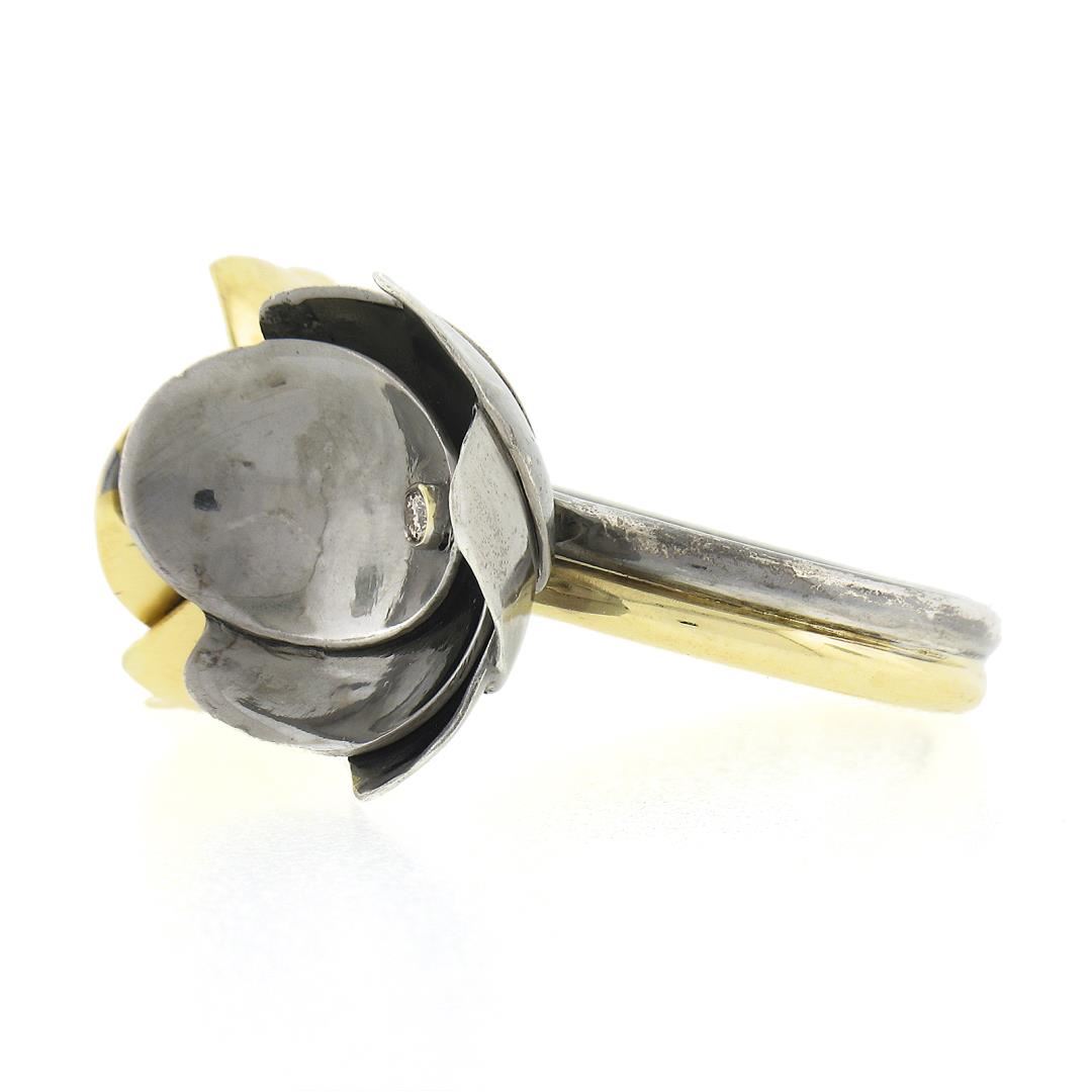 A solid 18k yellow gold & silver flower ring, with 2 round cut natural diamonds (0.04ctw). The ring is size 6.5, weighs a total of 12.12 grams, and measures 16mm wide.