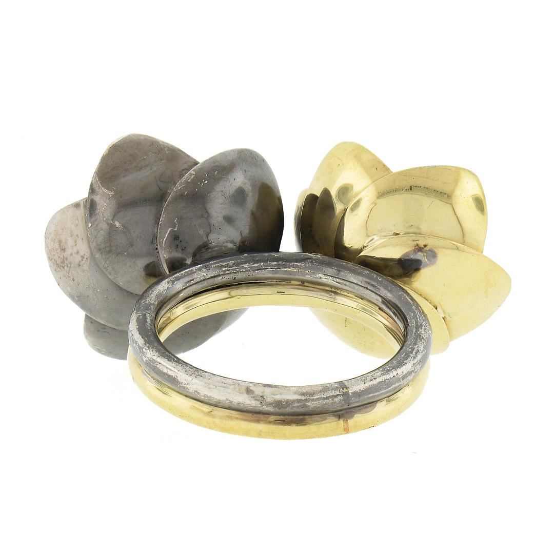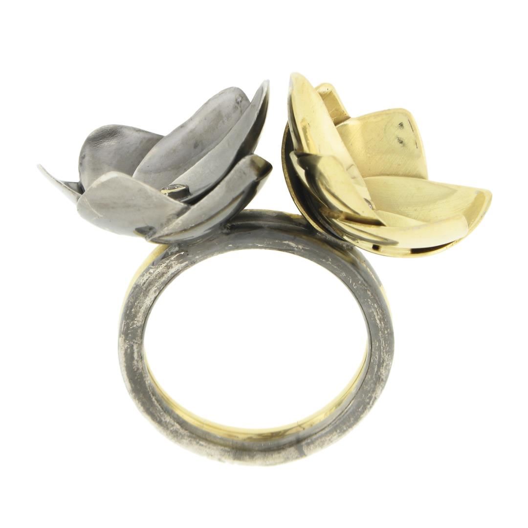 A solid 18k yellow gold & silver flower ring, with 2 round cut natural diamonds (0.04ctw). The ring is size 6.5, weighs a total of 12.12 grams, and measures 16mm wide.