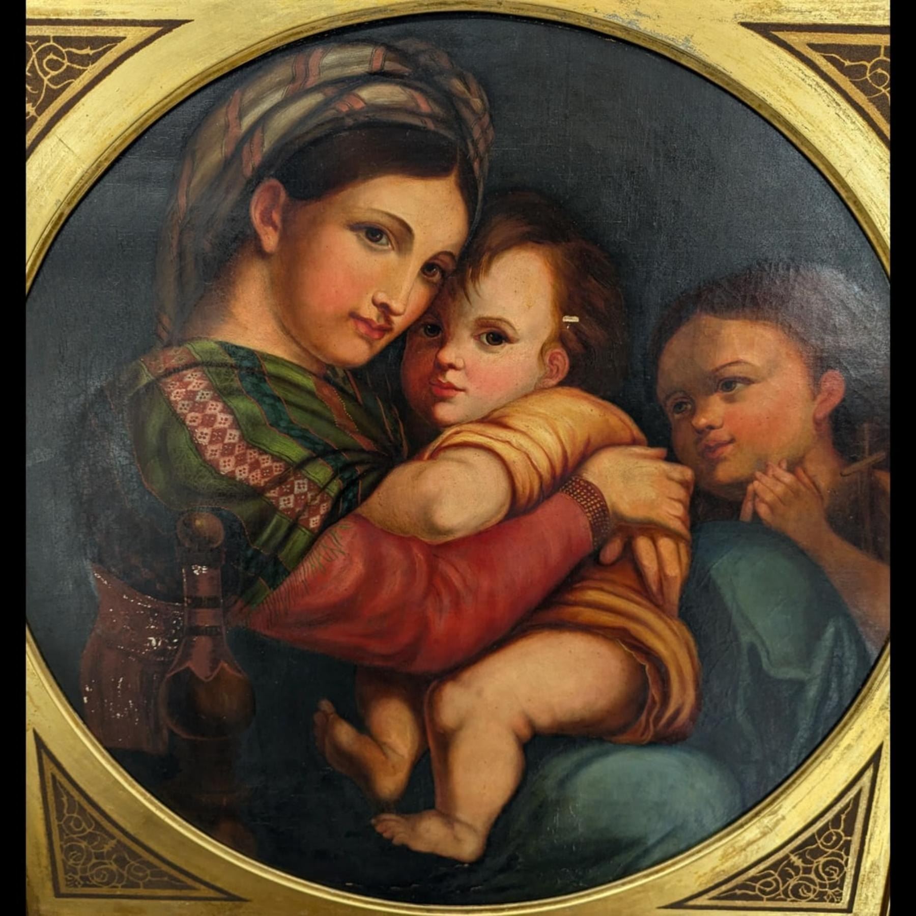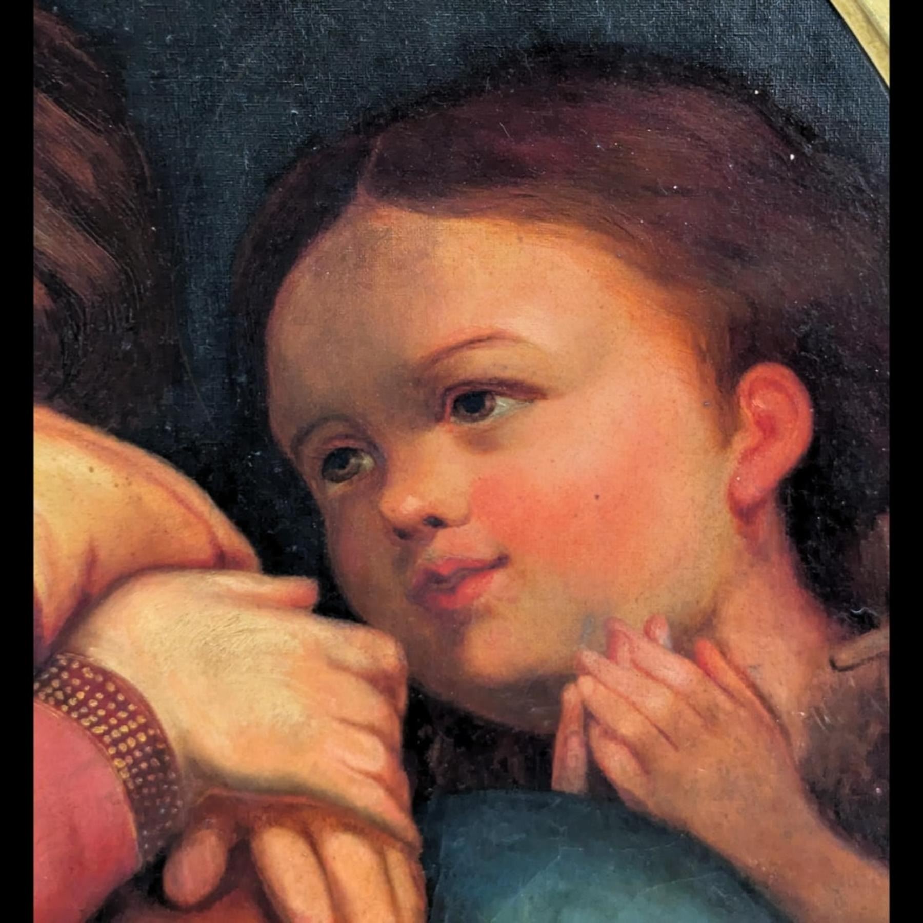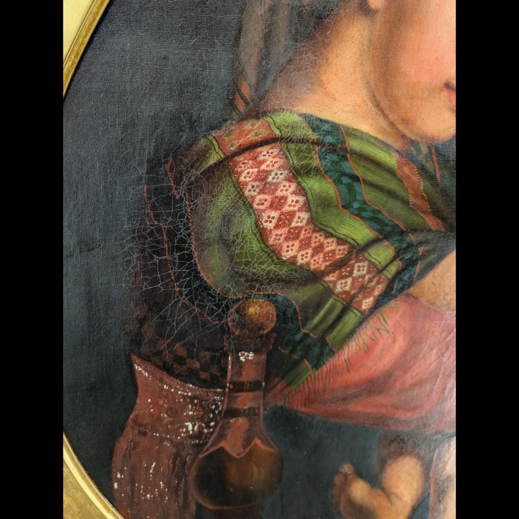 Large 18th-19th Century Oil On Canvas Family Portait Painting. Please note there is some wear and a few tears/repairs on the canvas, see pics. Measures approx. from 35 1/2" X 35 1/2", Sight measures approx. 27 1/2" in diameter.