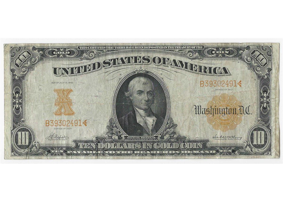 One Large 1907 $10 Gold Certificate Note.