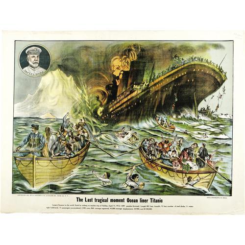 <B>1912 Large Color Lithograph of the Sinking of the Titanic</B></I> entitled (in dubious English) "The Last Tragical moment Ocean liner Titanic" with a caption that reads, in part: "Largest Steamer in the world. Sunk by iceberg on maiden trip of Halifax, April 15, 1912; 1,600 peoples drowned..." This was published by E. Giovine & Co. of 23 Duane St., Door 612, N.Y. and is also notated "Tipo-Litografia R. Sala." The image is bright and graphic showing the iceberg, the burning ship, a few wooden lifeboats, and people everywhere in panic mode- in the water, in the boats, jumping off the ship, etc. In the upper left corner is a round inset portrait image of Capt. Smith. This obviously originated in Europe- probably Spain or Italy and was quickly (and poorly) translated for issue in the United States to take advantage of the public demand for items related to this terrible tragedy. Generally fine condition with a few barely-noticeable small flaws repaired on the verso and one corner crinkle not affecting the image that could be matted out, 22" x 16.75". A rare and very displayable period Titanic print.<BR><BR><b>Shipping:</b> Small Flat (<a target="_blank" href="http://www.heritageauctions.com/common/shipping.php">view shipping information</a>)