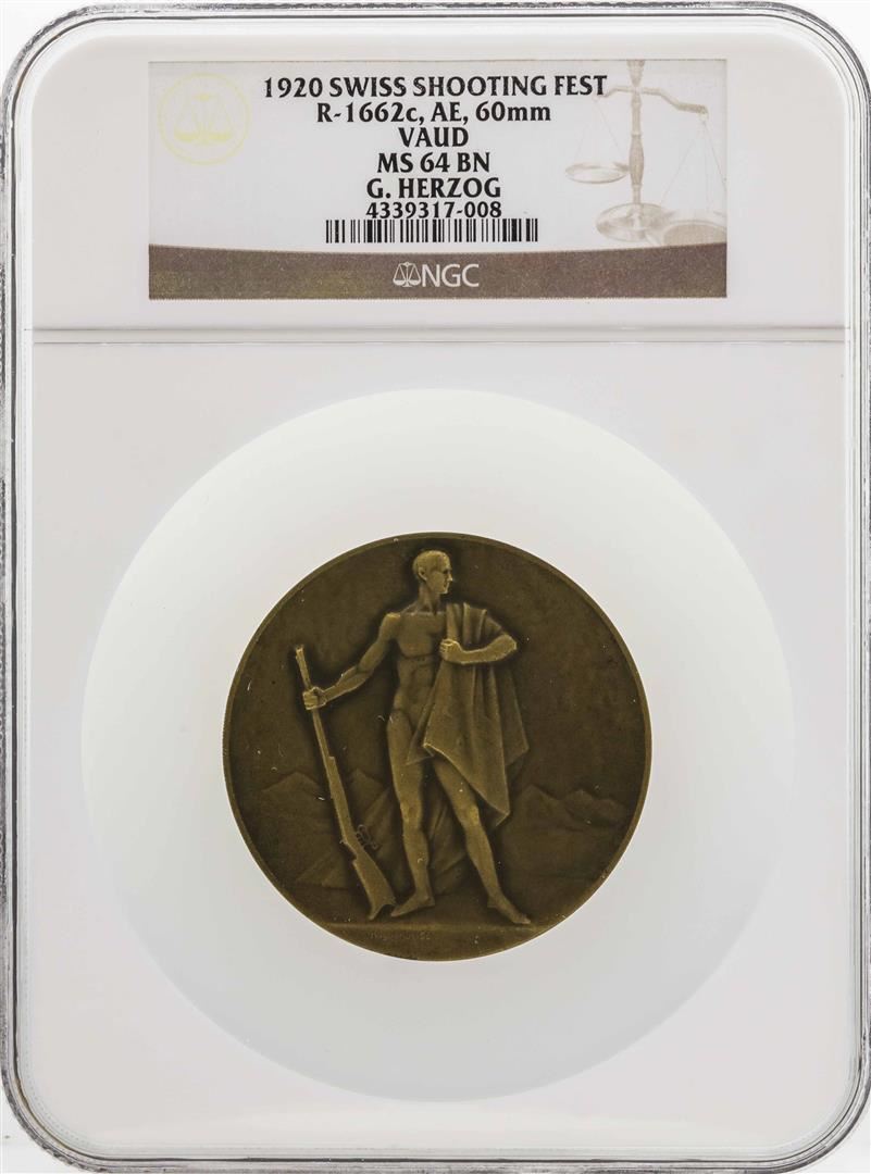 One Large 1920 Swiss Shooting Fest Vaud 60mm Medal NGC MS64BN. NGC Certified.