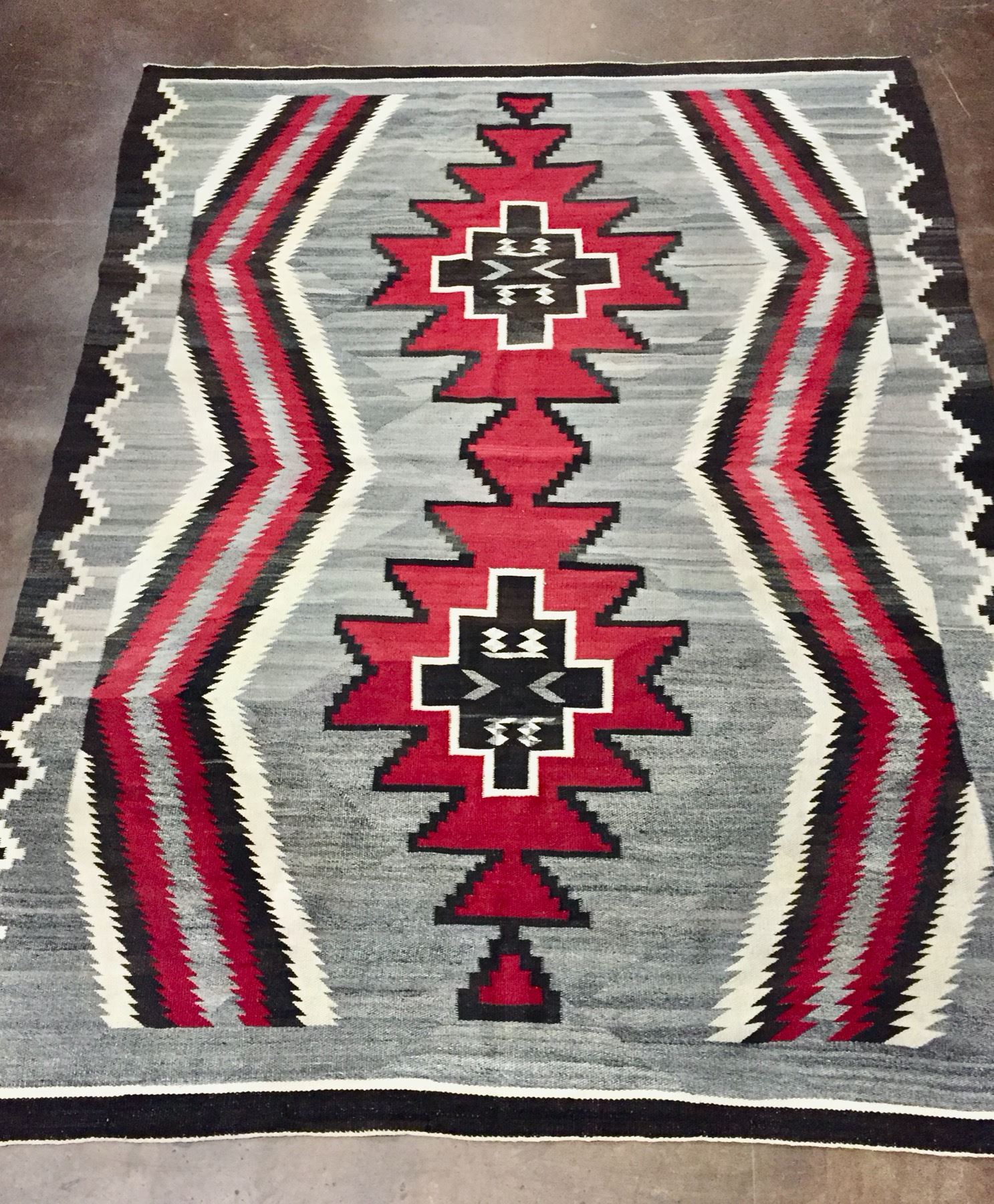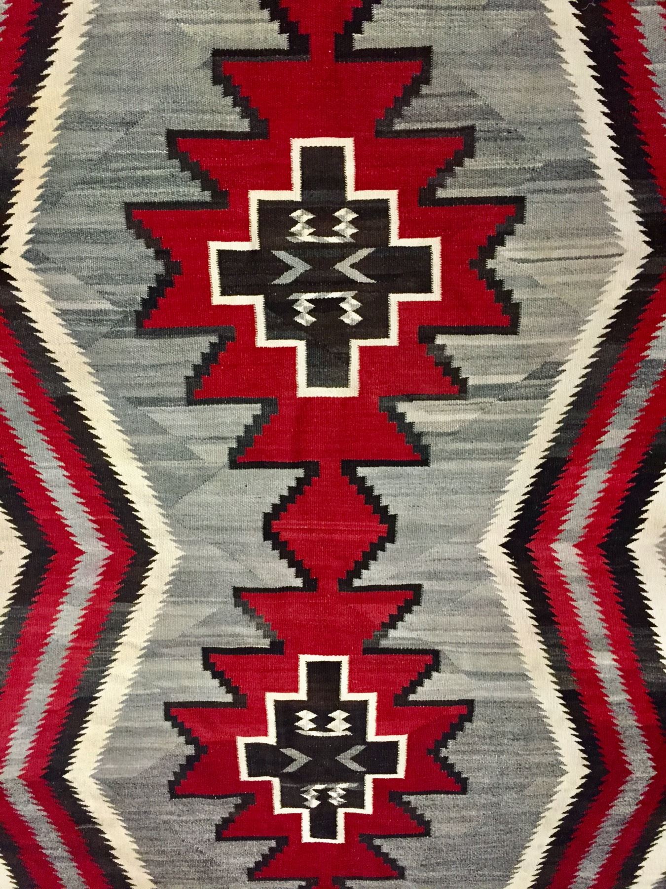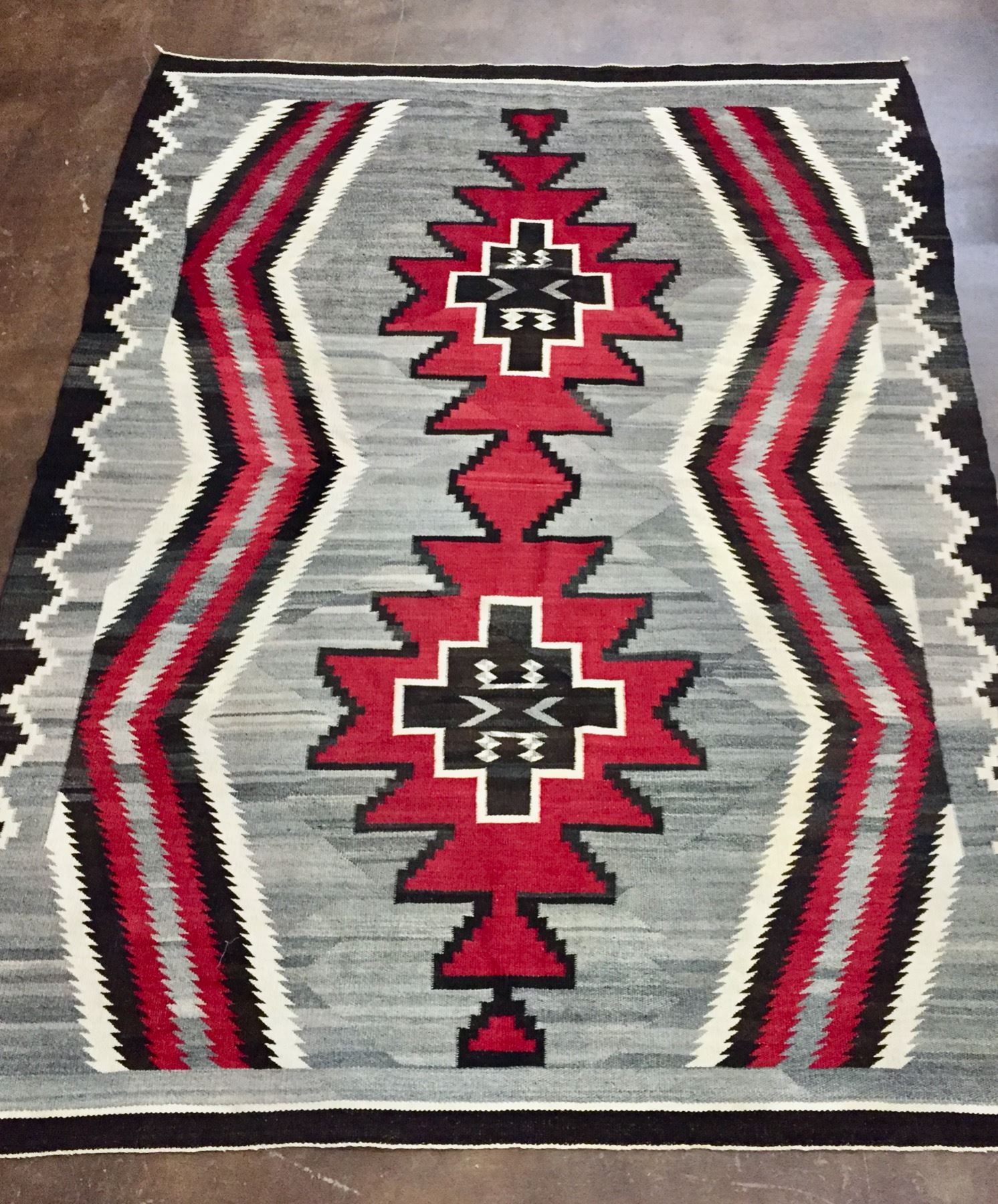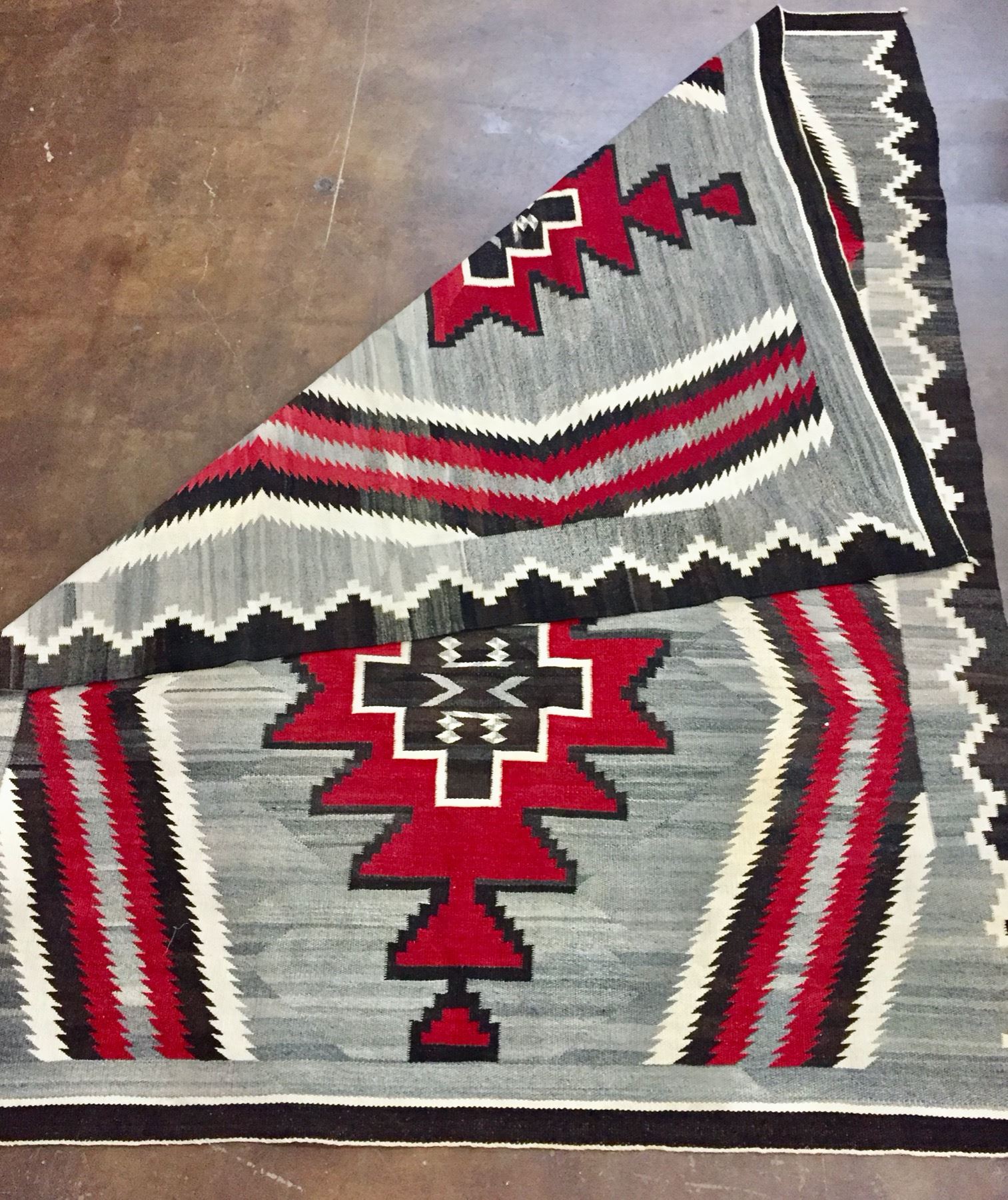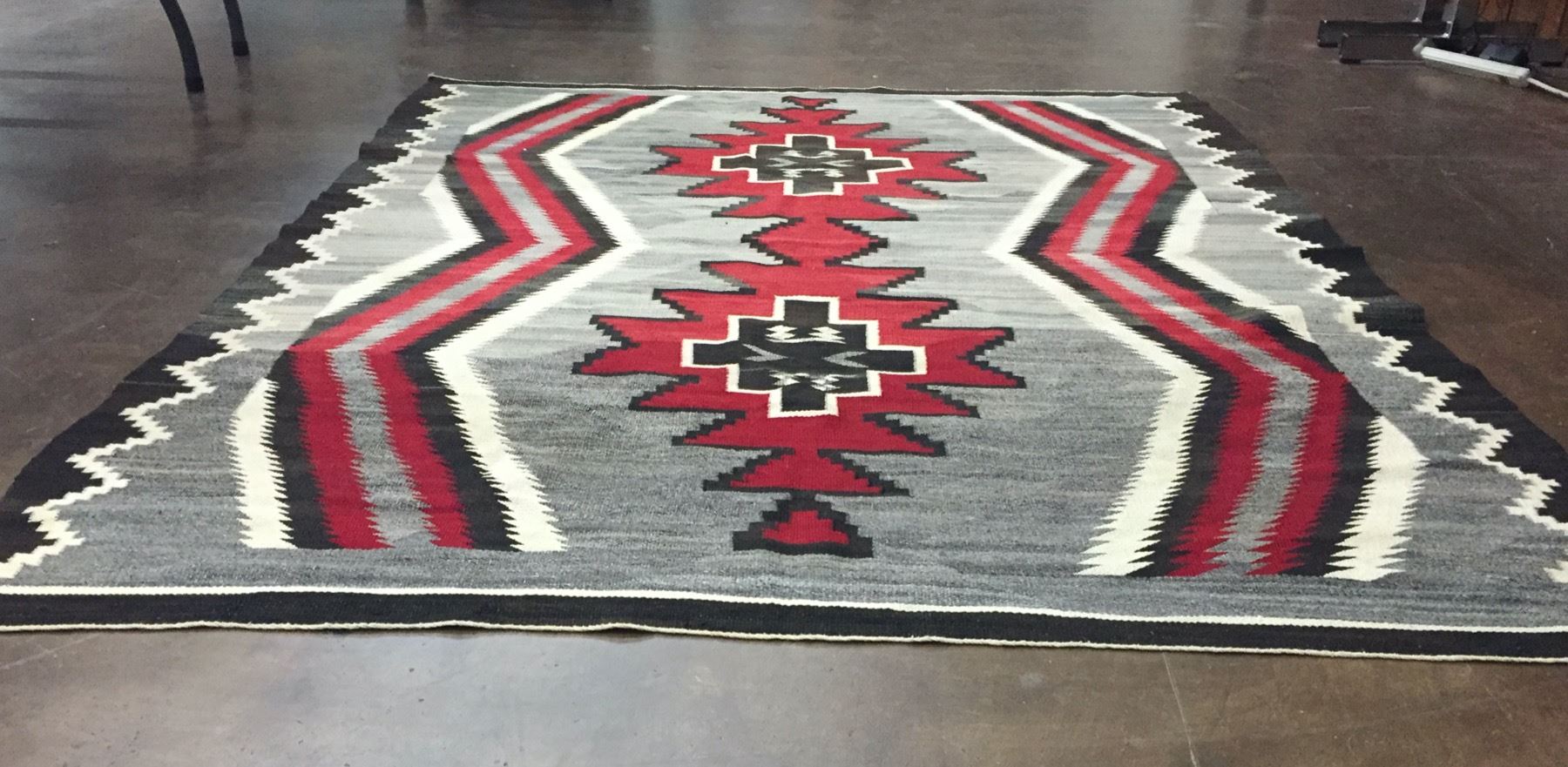 Description: Presented for sale in this lot is a good looking older Navajo textile. This was an old floor rug but it was well cared for. It uses hand spun wool in a stunning pattern with red, cream, brown and gray colors. Maker: Unknown Navajo Weaver. Approx. Age: Circa 1920s. Size: 80 inches long x 62 inches wide. Condition: Pretty good for its age, moderate wear expected. Please look closely at the pictures - they are an important part of our description. Shipping: There will be a $10 handling, packaging fee for shipping this lot. The actual cost of postage will be added on top of that.