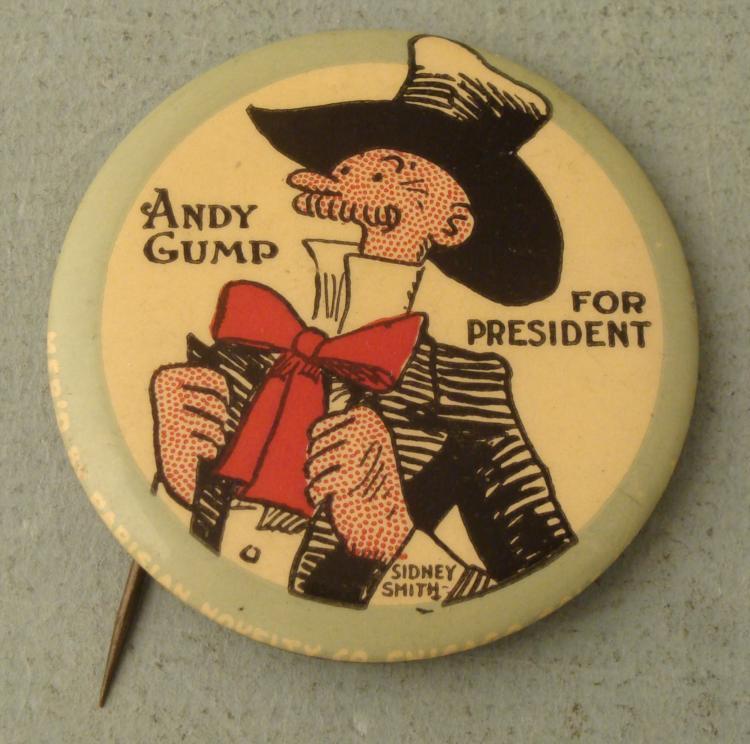 Original Andy Gump For President Pin Size: 2" in diameter Condition: Excellent Marked: "MANUFACTURED BY PARISIAN NOVELTY COMPANY, CHICAGO SOLE LICENCEES" Date: 1920's Rarity: Considered Very Rare