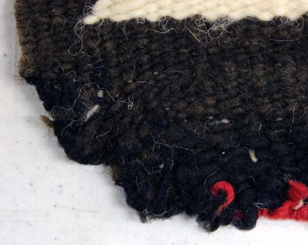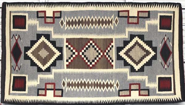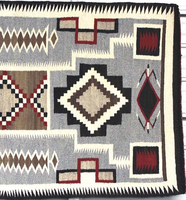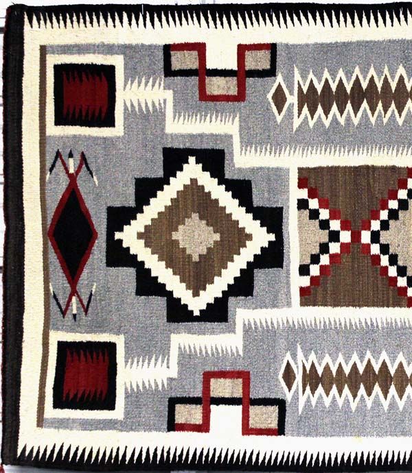 Large 1940 Navajo Traditional Storm Pattern Rug, measures approx. 45'' x 82''. Rug has two Water Bugs on the side and two opposing serrated diamonds. Pattern of serrated divided diamonds in the middle. Selvage is good. Crisp color