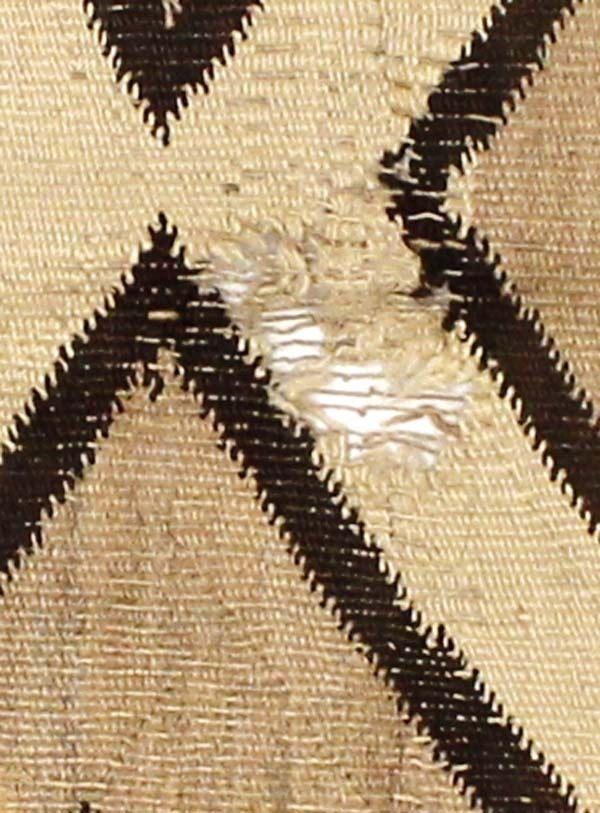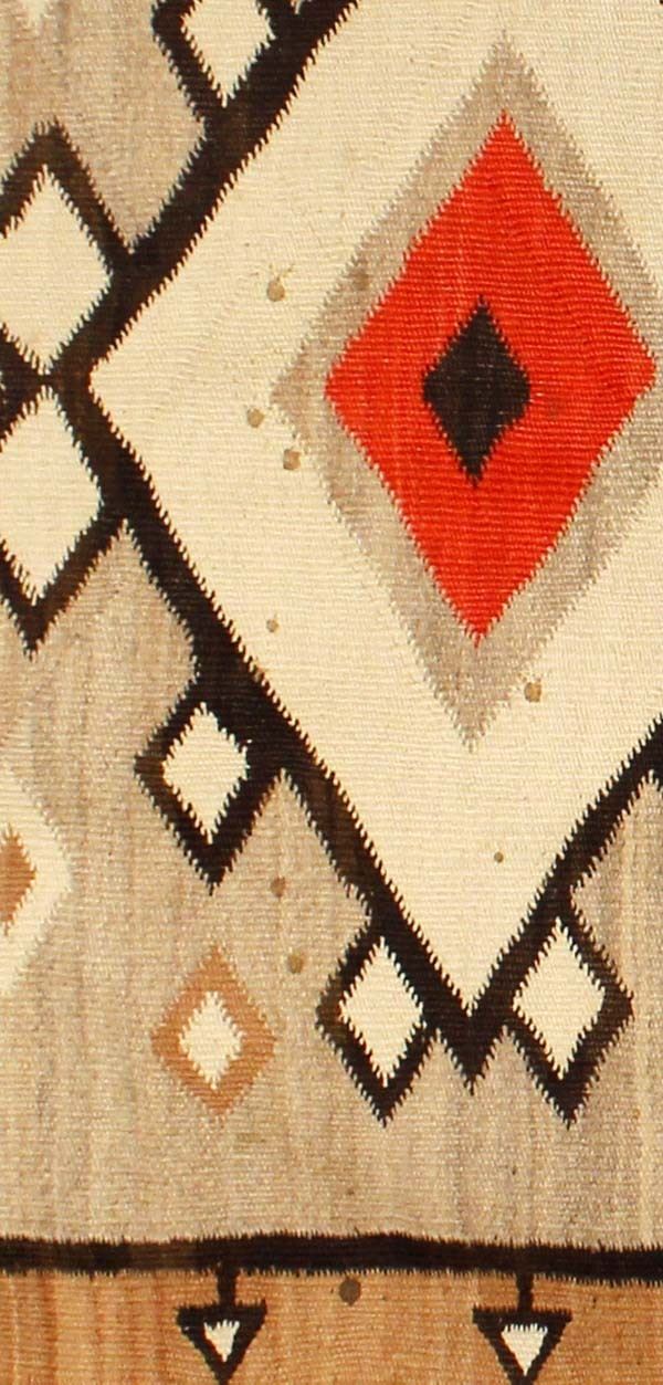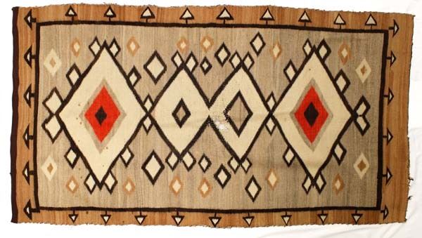 Large 1950's Native American Traditional Navajo Rug, measures 79''L x 43.5''W, selvage damage and does have hole in the center that does not go completely through to the other side, stained on one side, this is from a family farm that the consignor's grandmother grew up on, near Newton, Kansas