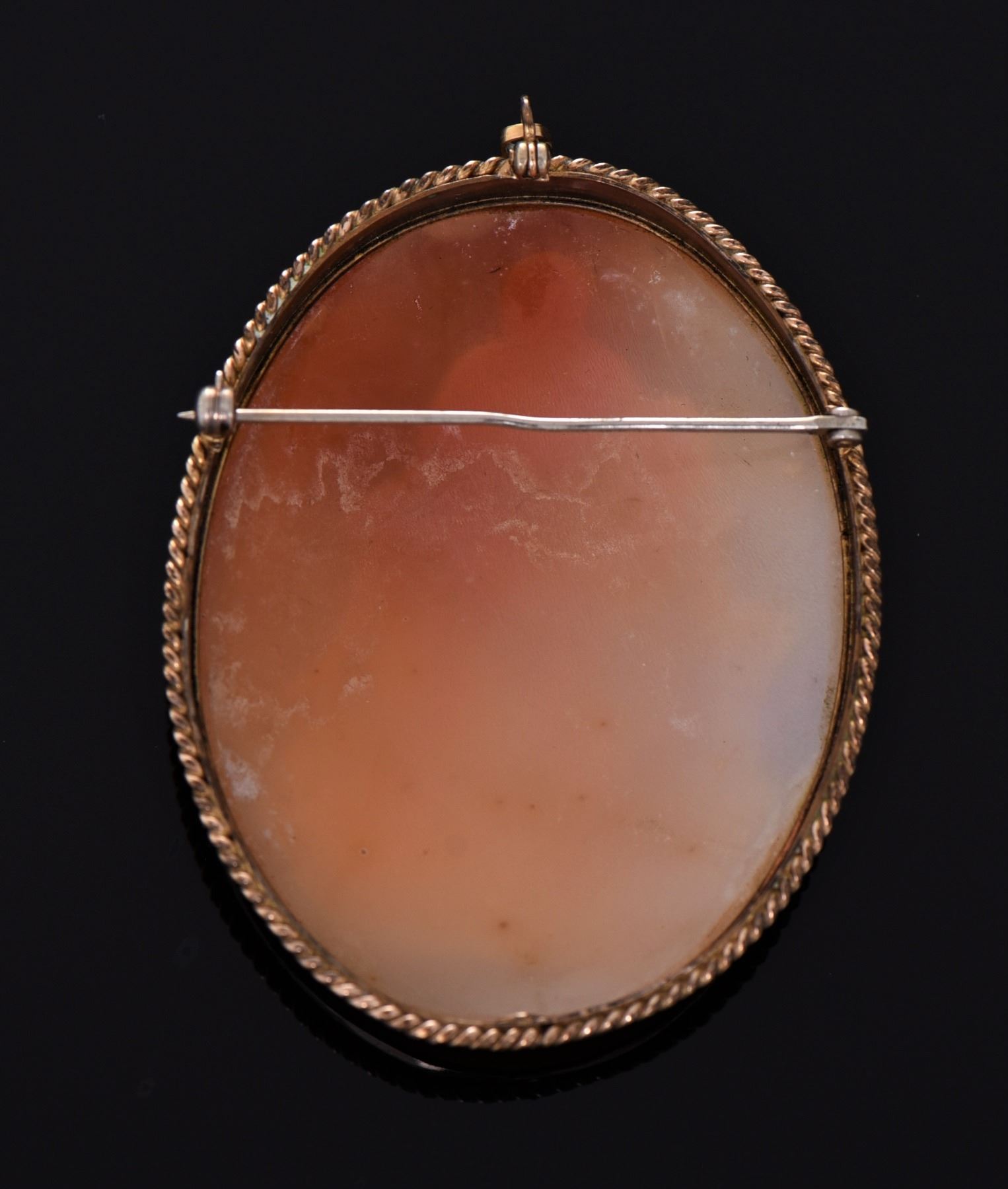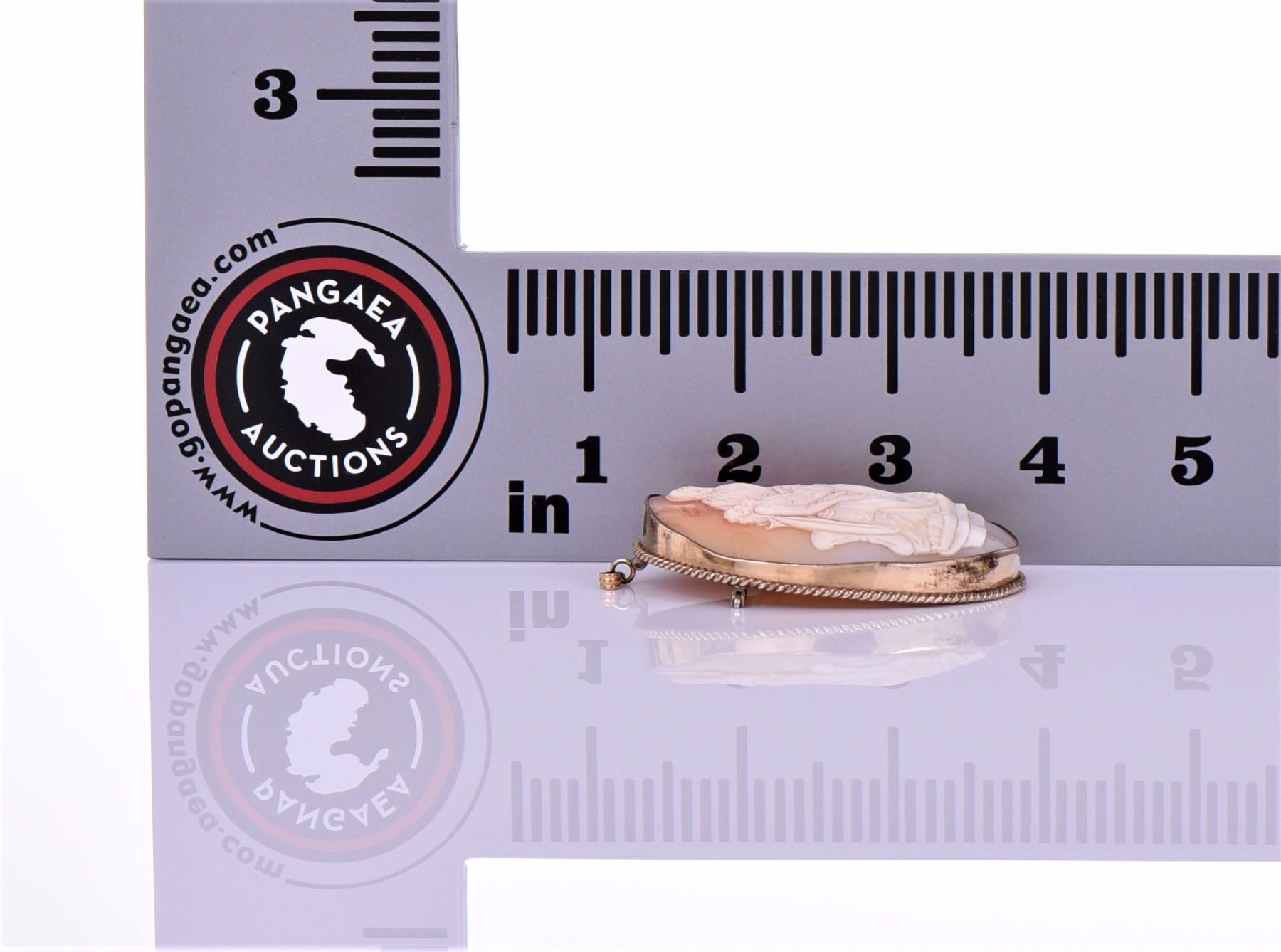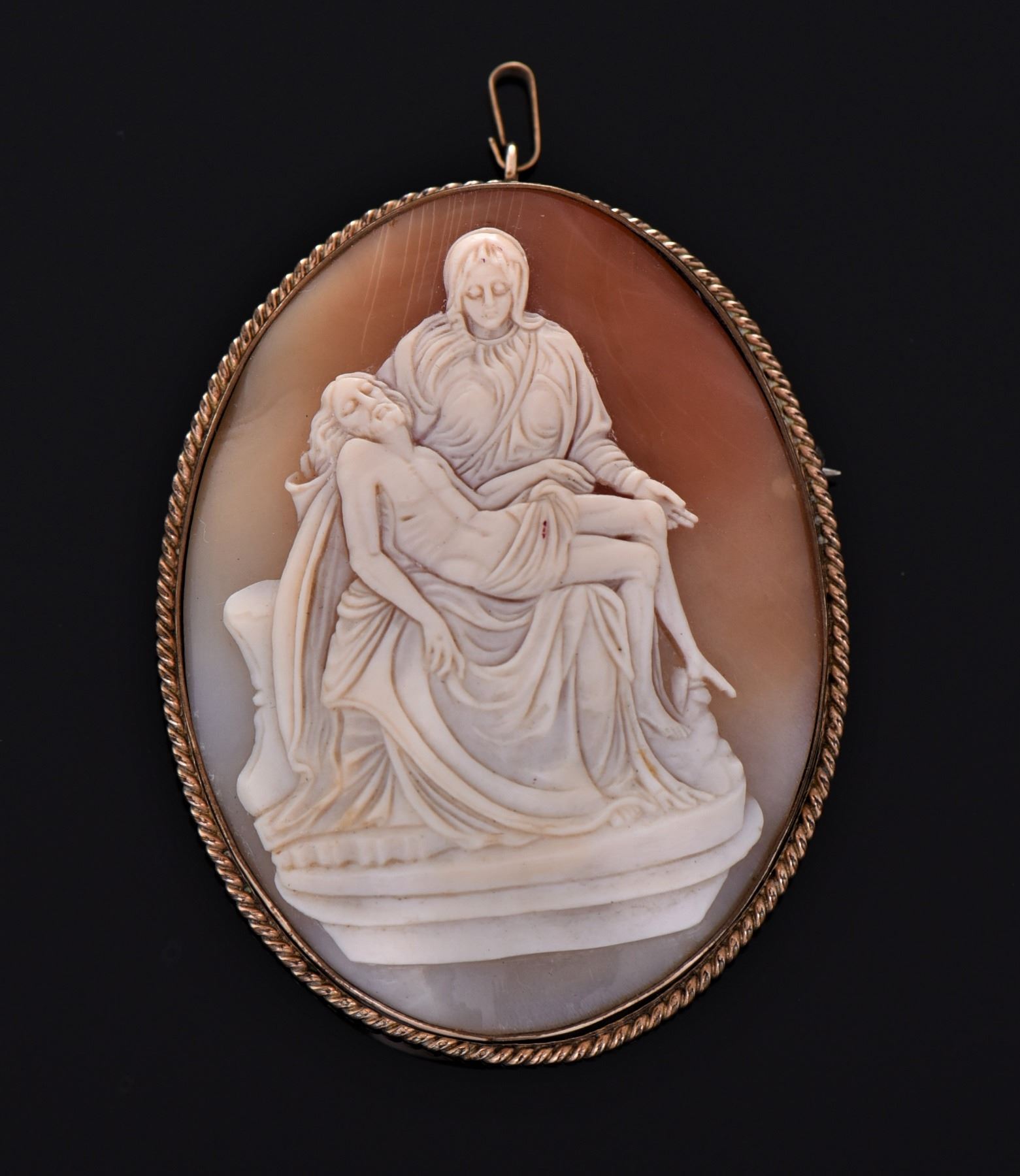 Large 19th Century Shell Cameo Brass Roped Brooch Pendant, Italy. A Carving of â??Pietaâ? by Michelangelo. Estimated more than 200 yrs. old. Italian art dates back to the Ancient Romans who left remains in Italy of extraordinary richness. Italian painting began to develop beyond the influence of Byzantium in the Duecento or 13th century, maintaining its lead throughout the Italian Renaissance, and reaching a particular peak in the High Renaissance of Leonardo da Vinci, Michelangelo and Raphael. Italy retained its artistic dominance into the 17th century with Mannerism and the Baroque. In the 18th century Neoclassicism originated in Rome, but this was the last such Italian-born style that spread to all Western art. However, Italy maintained a presence in the international art scene from the mid 19th century onwards. Italian art has influenced several major movements throughout the centuries and has produced several great artists, including painters, architects and sculptors. (Wikipedia) Size and/or Weight: See Measurement Photo. (Photos Represent The Lot Condition, Pangaea Auctions)