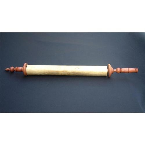 Large 19th. century manuscript of Megilat Esther on parchment sheets hand sewn and rolled on a wood scroll with 2 handles for easy scrolling. The Hebrew calligraphy is superlative and flawless. Very rare manuscript of these large proportions!.Parchment width: 19" (48 cm.). Scroll width: 35" (89 cm.). Estimated value: $21.000.