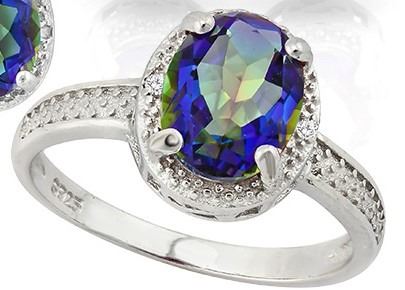 Oval cut Ocean Mystic topaz weighs 2.5 carats and is set in a halo-style mounting with 0.01ctw diamond accent. Mounting is Platinum over Sterling Silver for added brilliance. Size 7. 2.3g